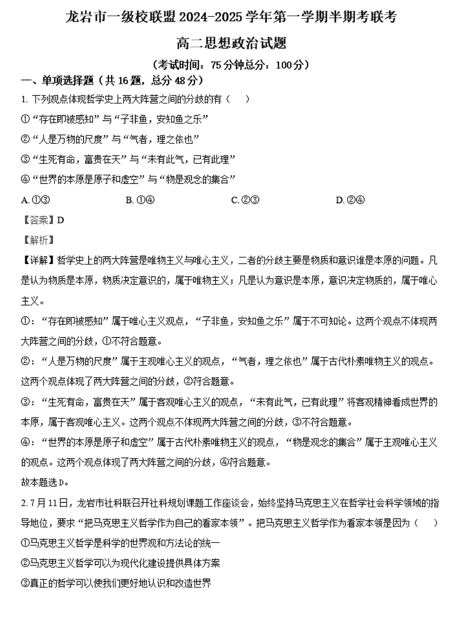 龙岩市一级校联盟2024-2025学年高二上11月期中政治试题及答案