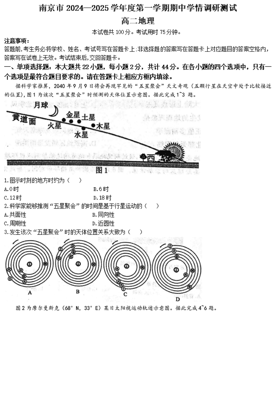 南京市2024-2025学年高二上学期期中地理试题及答案