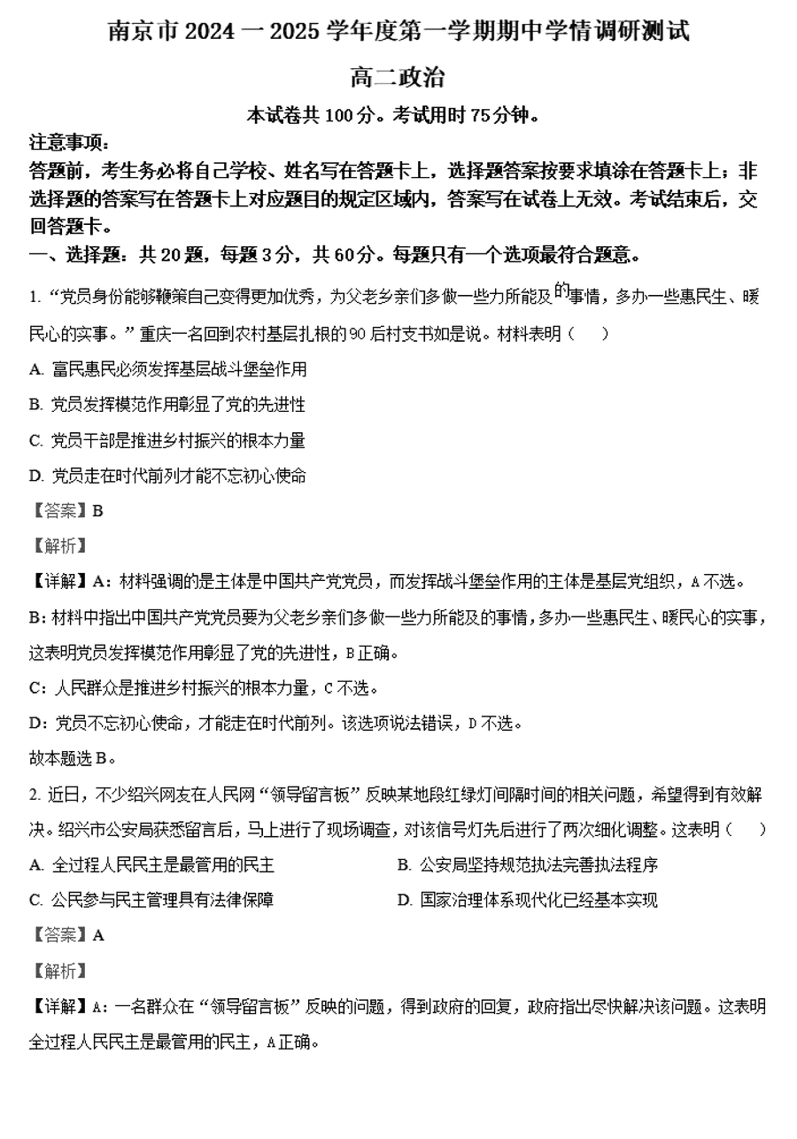 南京市2024-2025学年高二上学期期中政治试题及答案