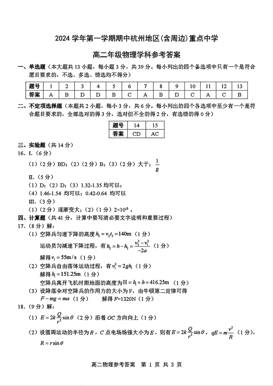 杭州地区(含周边)重点中学2024-2025学年高二上学期11月期中物理考试已于近日开考,为方便考生考后及时查看考试情况,查漏补缺、弥补不足,本文整理了试题答案解析相关信息!