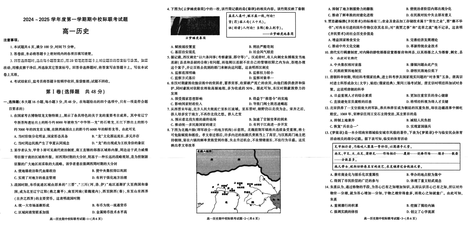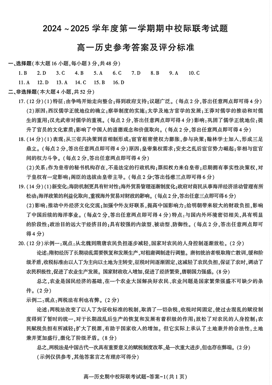 汉中期中联考2024-2025学年高一11月期中历史试题及答案