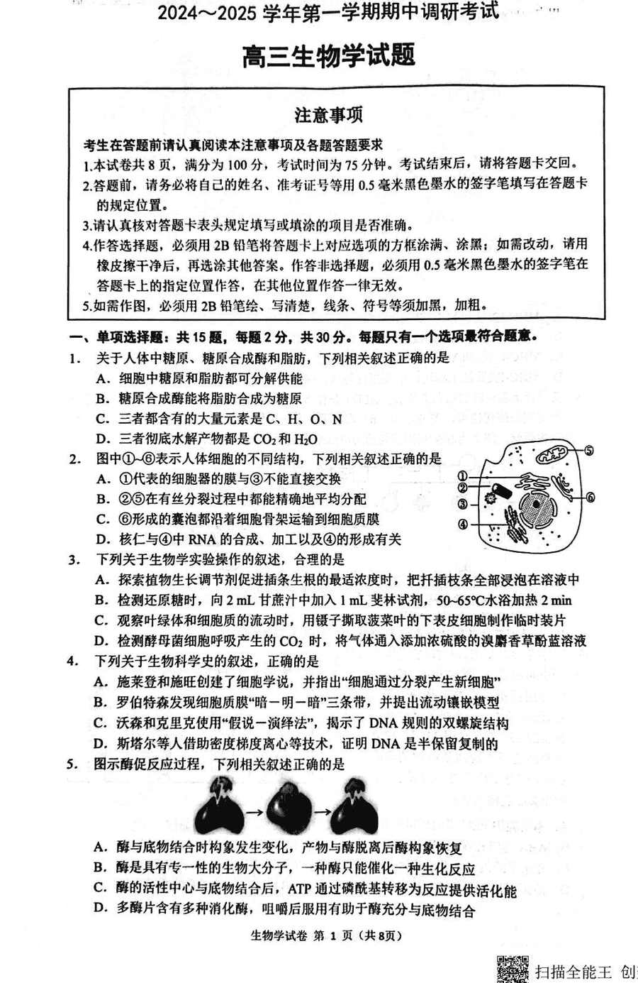 江苏连云港市2024-2025学年高三上学期期中生物考试已于近日开考,为方便考生考后及时查看考试情况,查漏补缺、弥补不足,本文整理了试题答案解析相关信息!