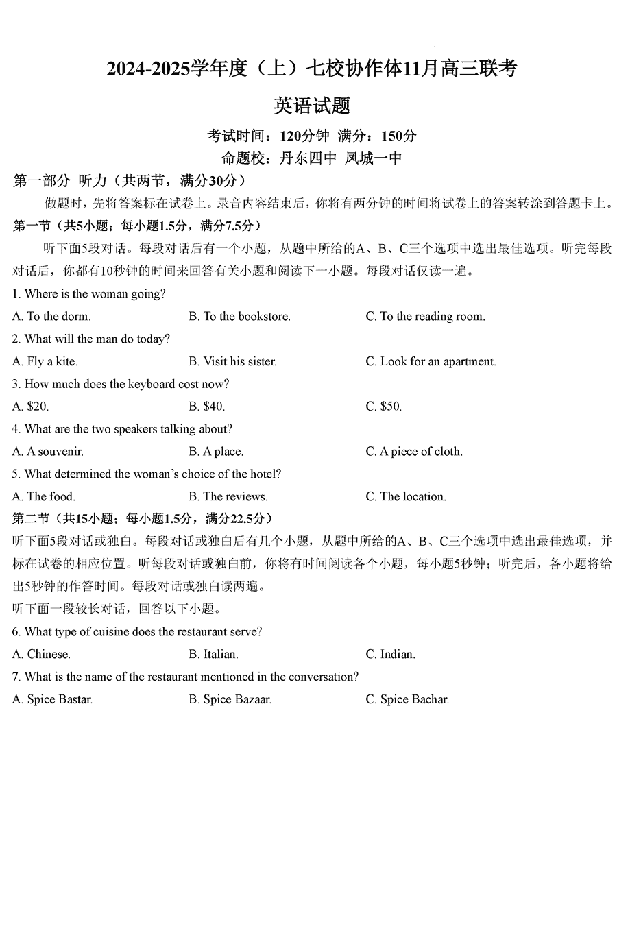 辽宁七校协作体2025届高三上学期11月期中英语试题及答案