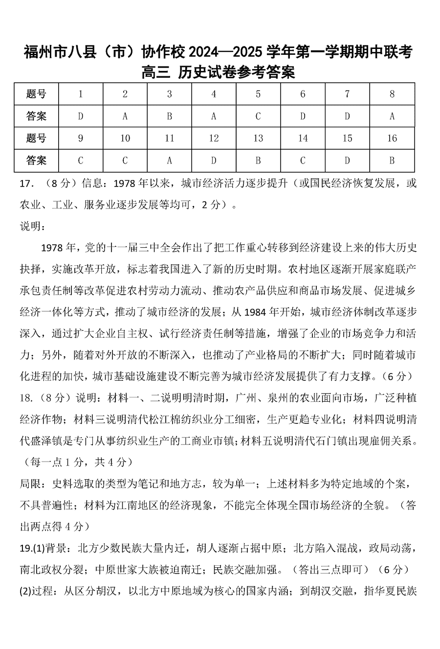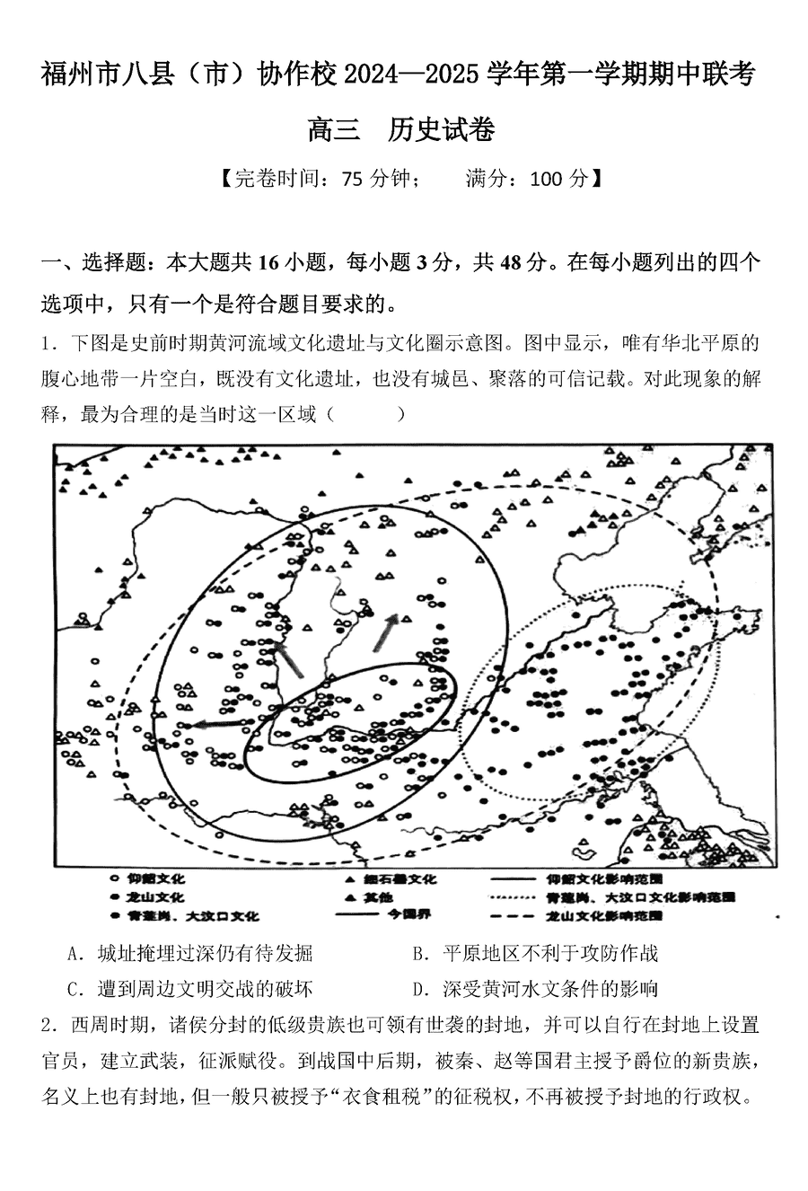 福州八县市协作校2025届高三上学期期中联考历史试题及答案