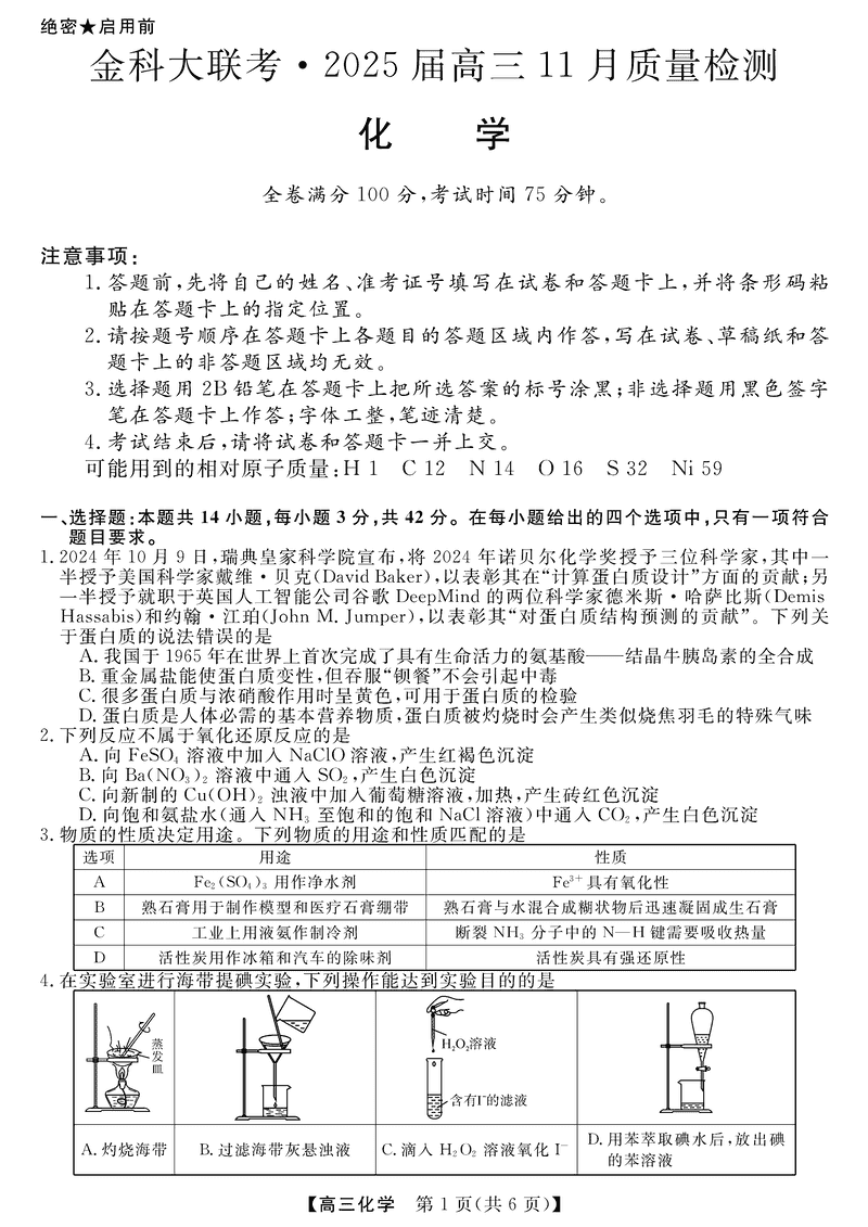 河南金科新未来大联考2025届高三上11月质检化学试题及答案