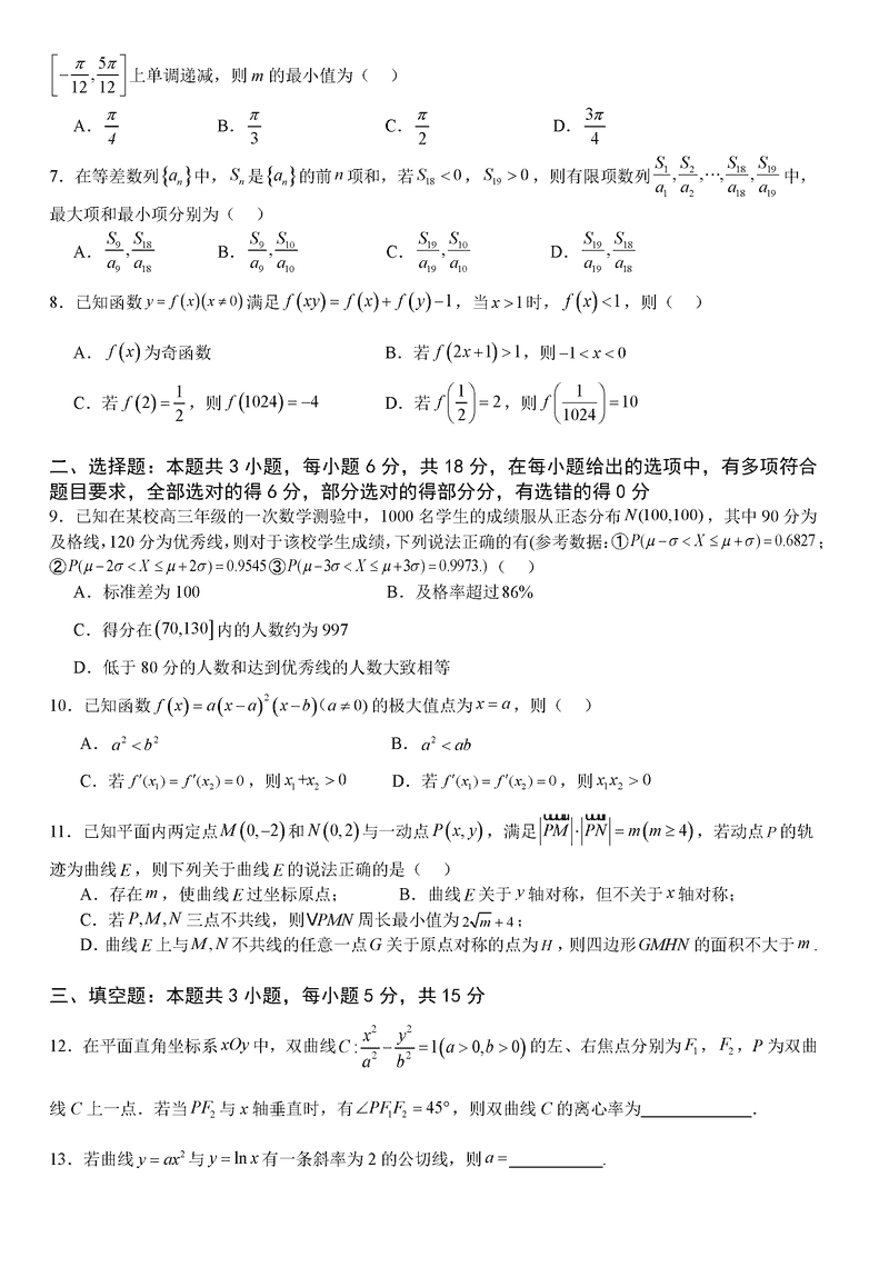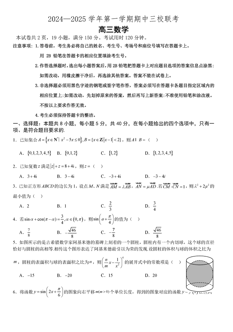 广州三校2024-2025学年高三上学期期中联考数学试题及答案