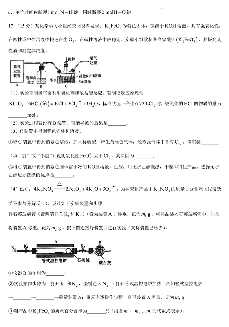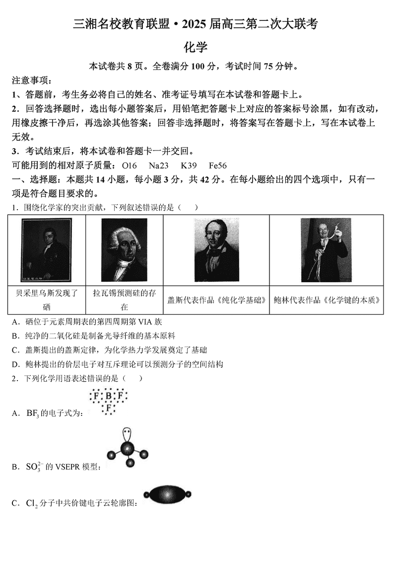 湖南三湘名校教育联盟2025届高三第二次大联考化学试题及答案