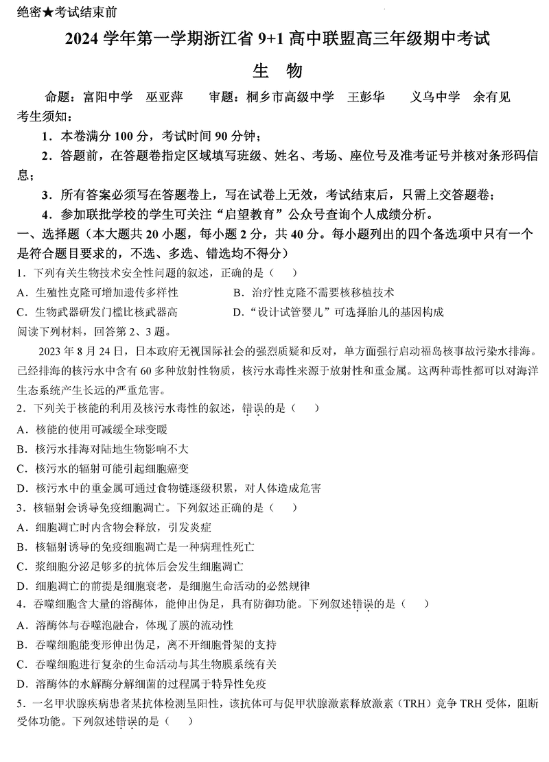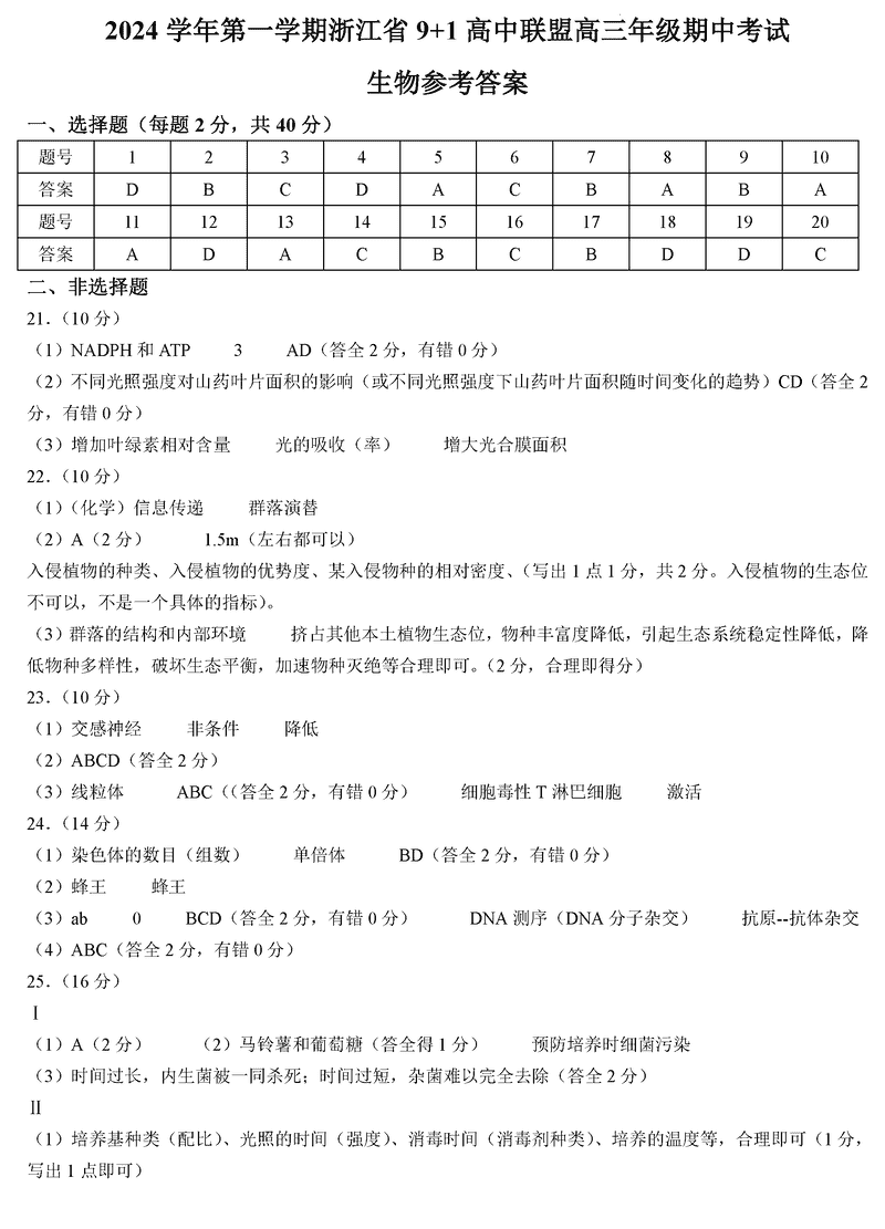 浙江省9+1高中联盟2025届高三期中生物考试已于近日开考,为方便考生考后及时查看考试情况,查漏补缺、弥补不足,本文整理了试题答案解析相关信息!