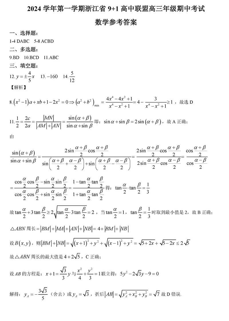 浙江省9+1高中联盟2025届高三期中数学考试已于近日开考,为方便考生考后及时查看考试情况,查漏补缺、弥补不足,本文整理了试题答案解析相关信息!