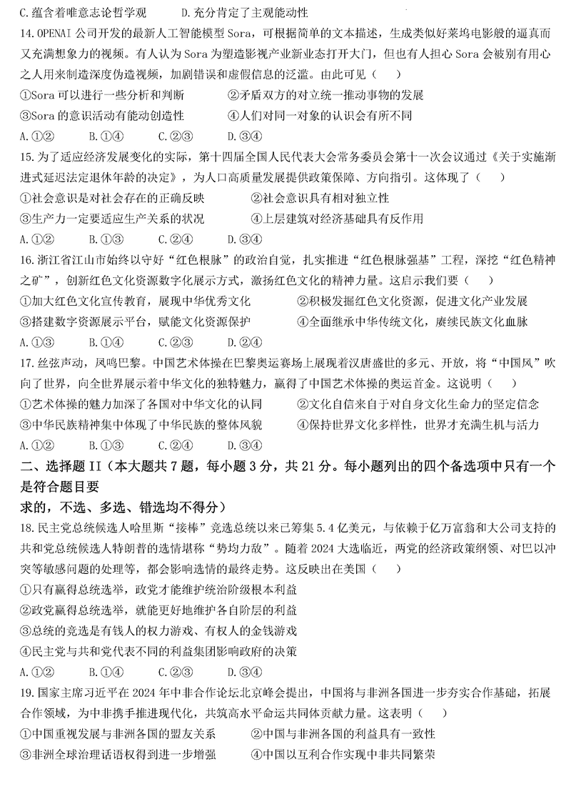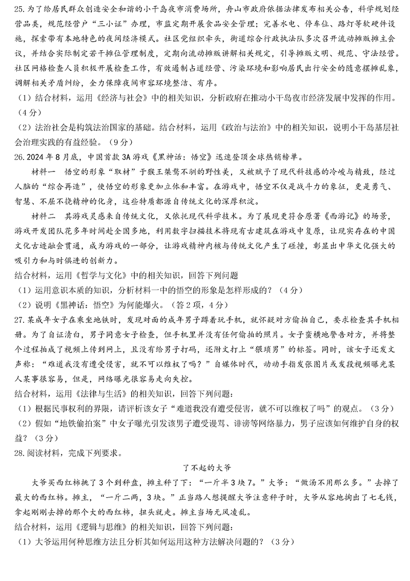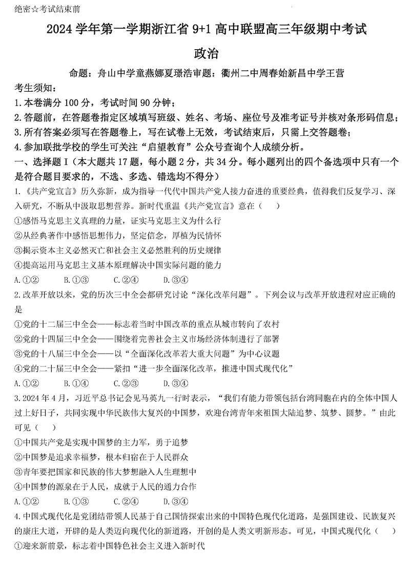 浙江省9+1高中联盟2025届高三期中政治试题及答案