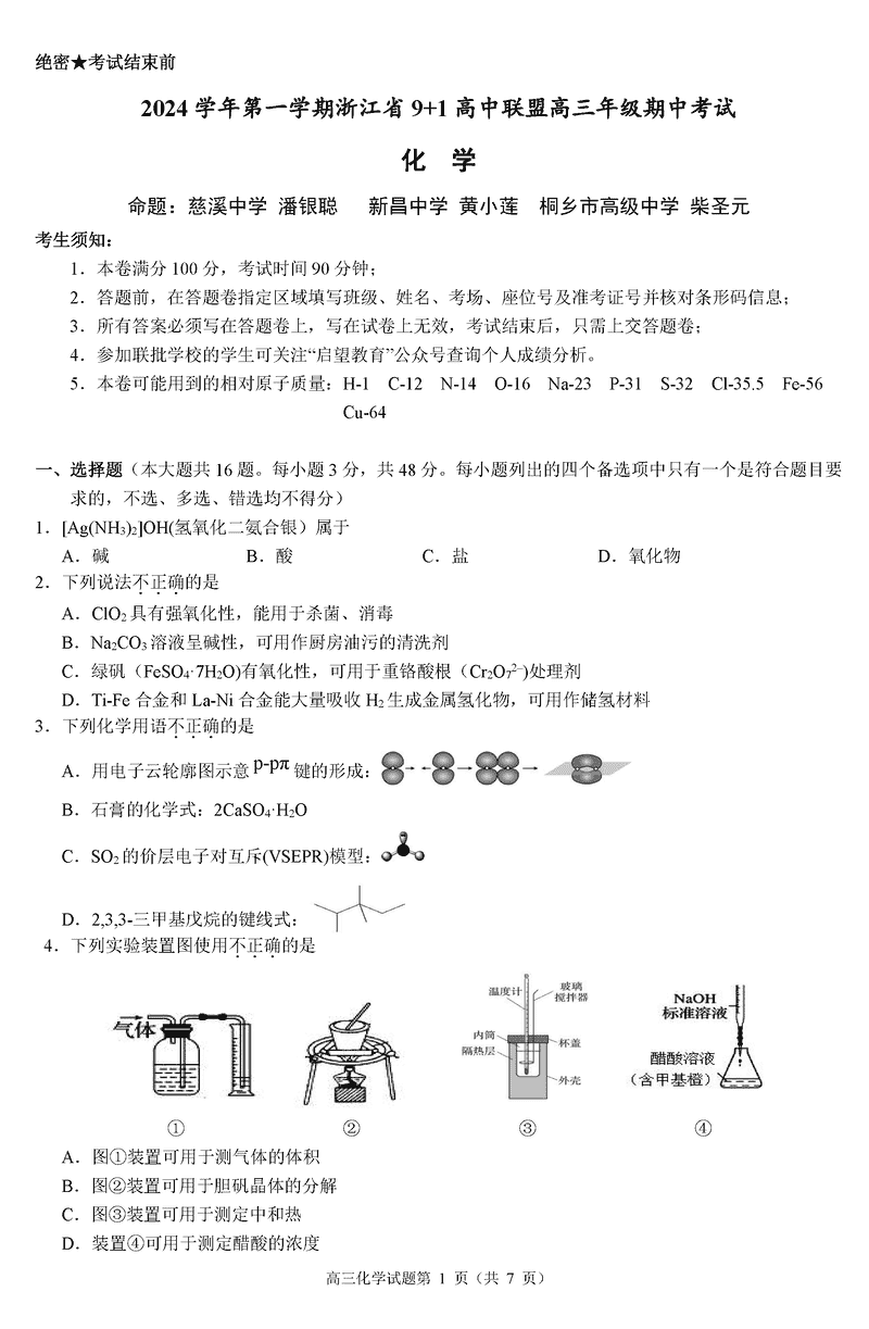 浙江省9+1高中联盟2025届高三期中化学考试已于近日开考,为方便考生考后及时查看考试情况,查漏补缺、弥补不足,本文整理了试题答案解析相关信息!