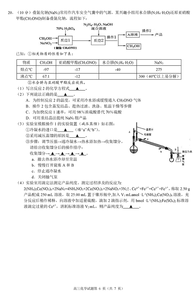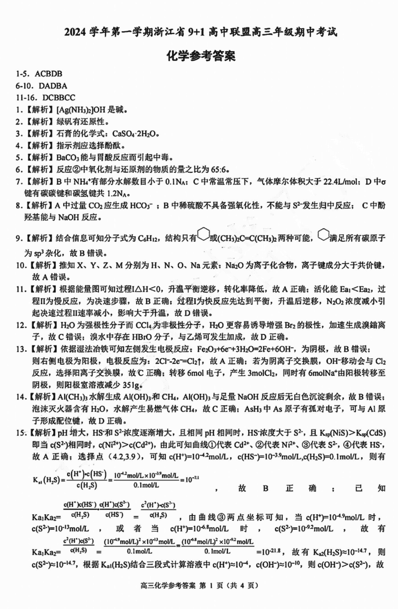 浙江省9+1高中联盟2025届高三期中化学试题及答案