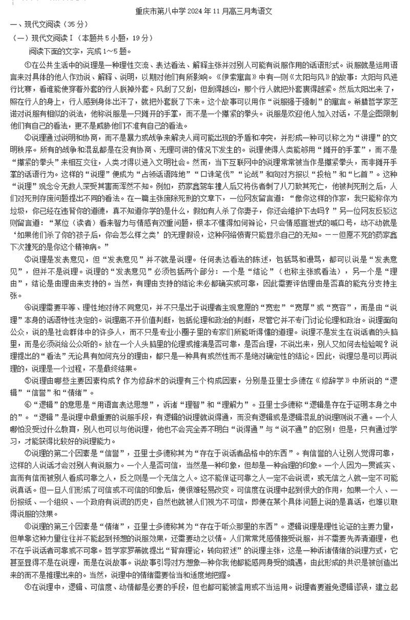 重庆八中2025届高三上学期适应性月考(三)语文考试已于近日开考,为方便考生考后及时查看考试情况,查漏补缺、弥补不足,本文整理了试题答案解析相关信息!
