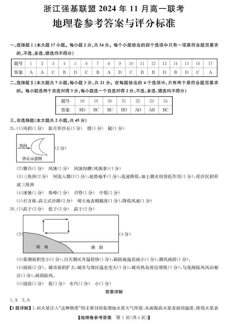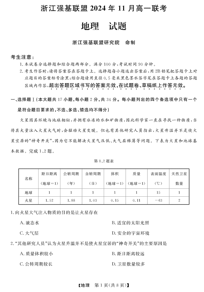 浙江强基联盟2024年11月高一上学期联考地理试题及答案 时间:2024-11-25 16:30 浙江 高中地理 浙江省强基联盟2024-2025学年高一上学期11月联考地理考试已于近日开考,为方便考生考后及时查看考试情况,查漏补缺、弥补不足,本文整理了试题答案解析相关信息! 地理试题及答案解析