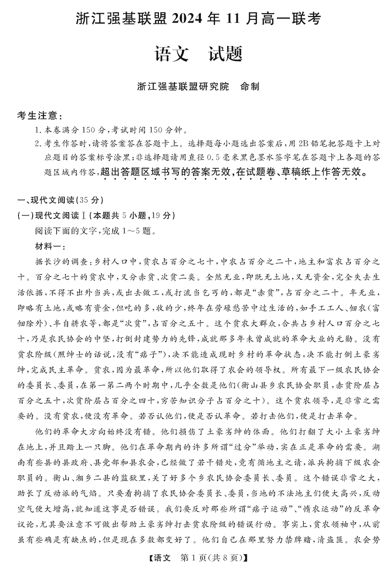 浙江强基联盟2024年11月高一上学期联考语文试题及答案 时间:2024-11-25 16:34 浙江 高中语文 浙江省强基联盟2024-2025学年高一上学期11月联考语文考试已于近日开考,为方便考生考后及时查看考试情况,查漏补缺、弥补不足,本文整理了试题答案解析相关信息! 语文试题及答案解析