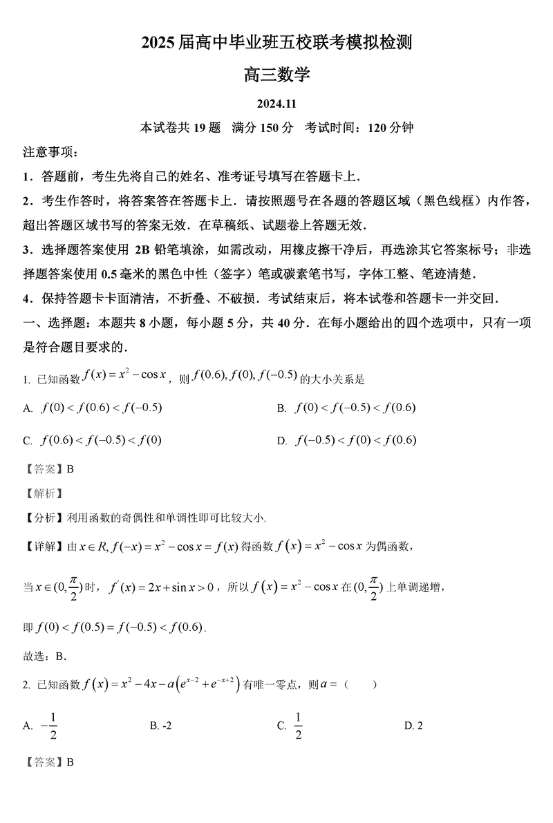 泉州五校2025届高三上学期11月期中联考数学考试已于近日开考,为方便考生考后及时查看考试情况,查漏补缺、弥补不足,本文整理了试题答案解析相关信息!