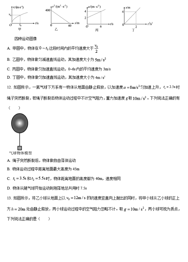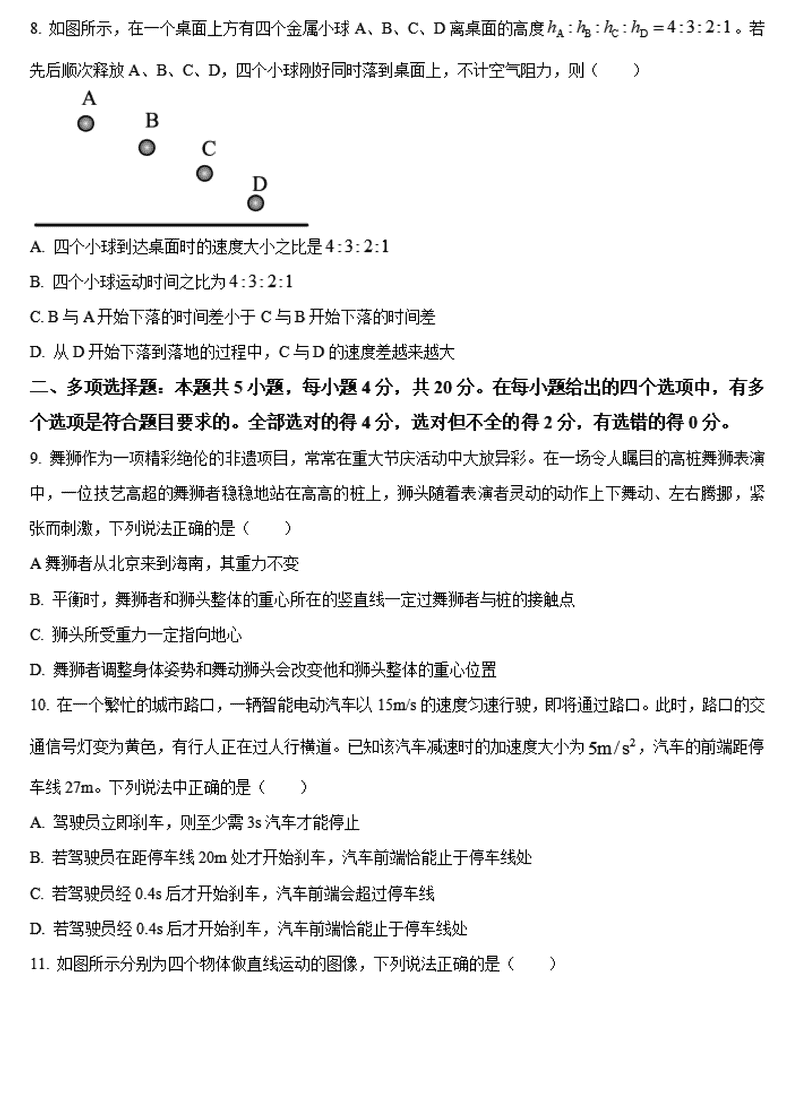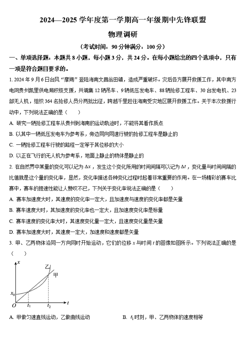 海南先锋联盟2024-2025学年高一上学期11月期中物理试题及答案