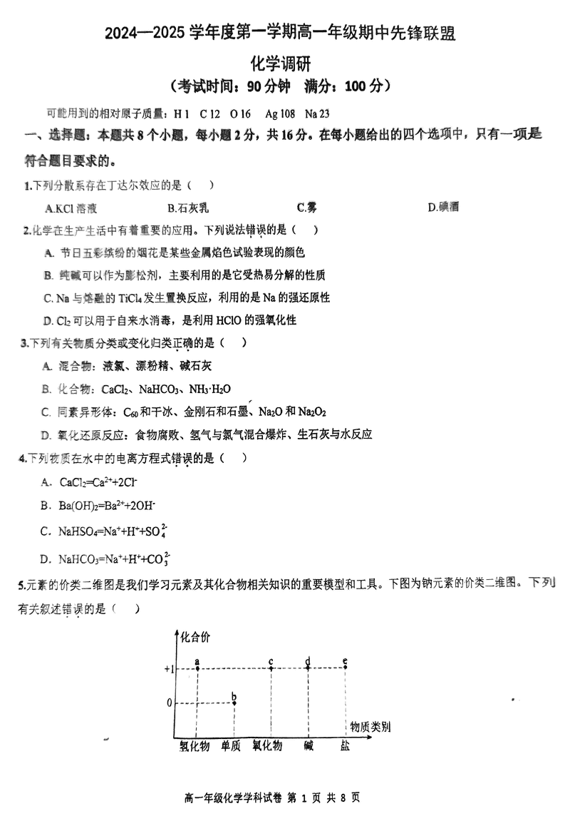 海南先锋联盟2024-2025学年高一上学期11月期中化学试题及答案