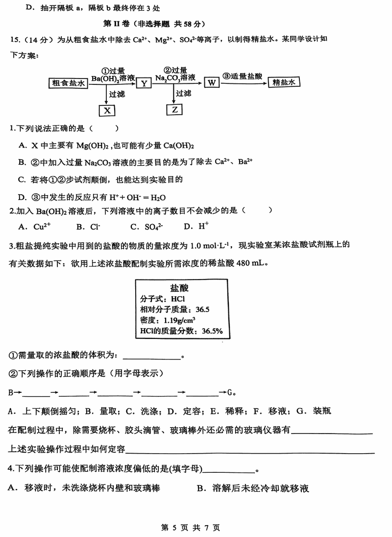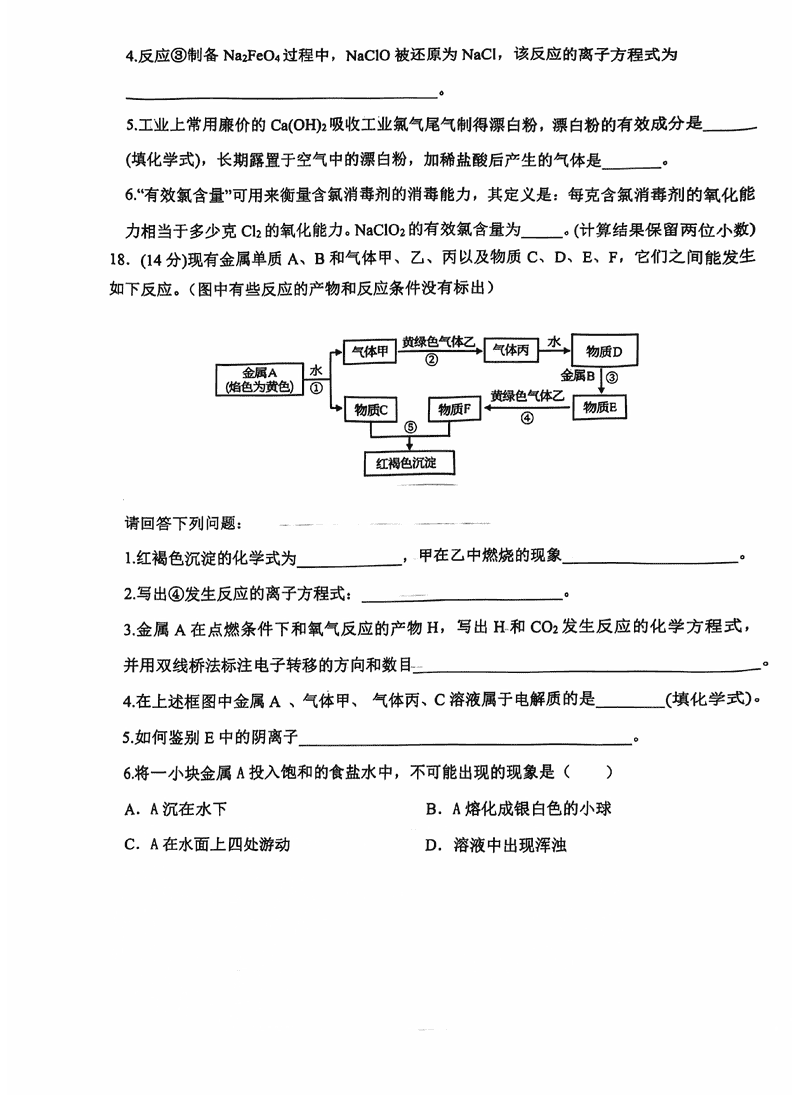 蚌埠市A层高中2024年11月高一第二次联考化学试题及答案