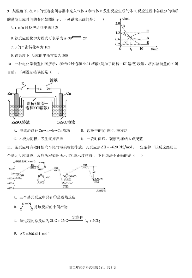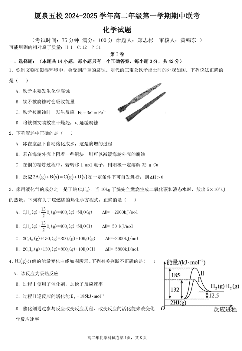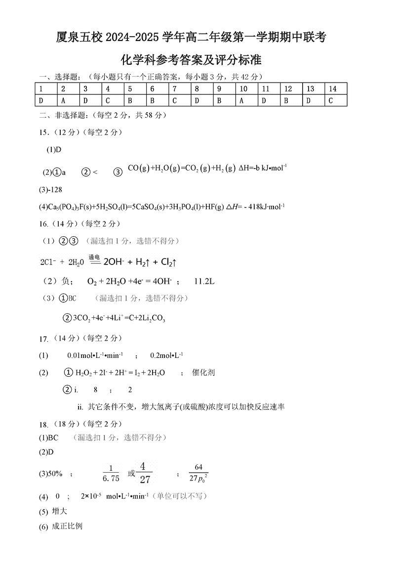 厦泉五校2024年11月高二上学期期中联考化学试题及答案