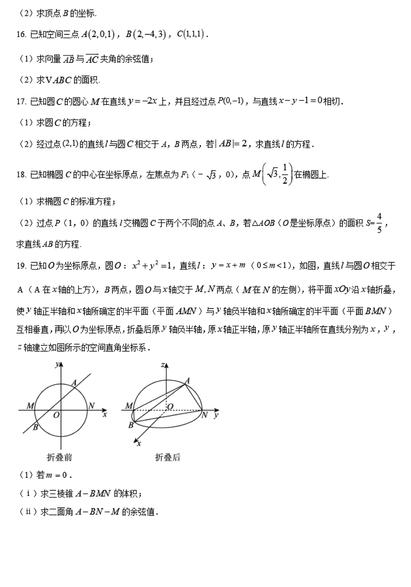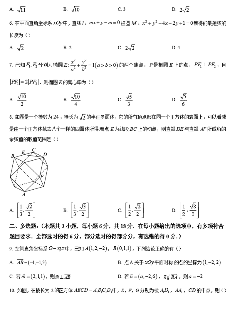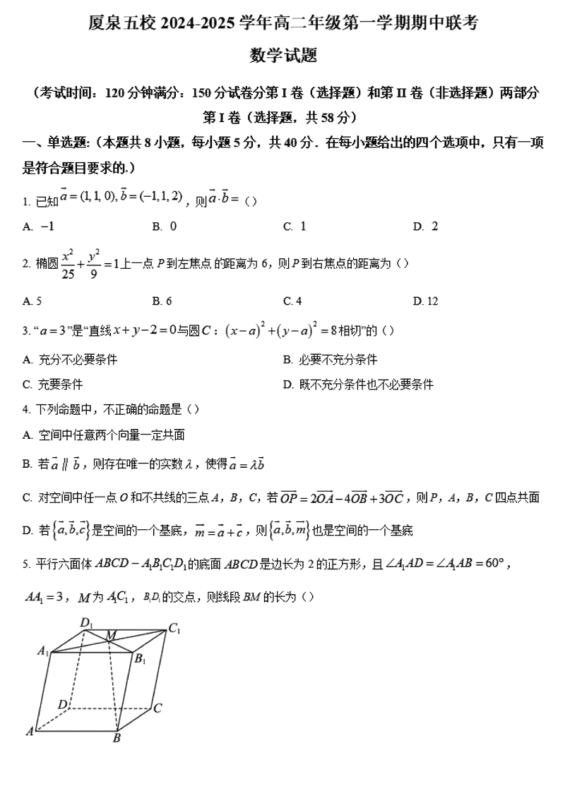 厦泉五校2024年11月高二上学期期中联考数学试题及答案