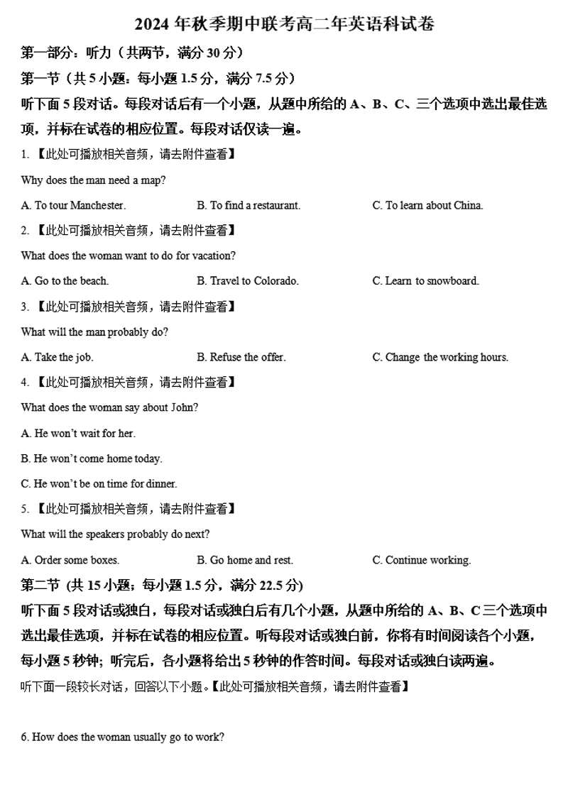 厦门市、泉州市五校2024-2025学年高二上学期11月期中联考英语考试已于近日开考,为方便考生考后及时查看考试情况,查漏补缺、弥补不足,本文整理了试题答案解析相关信息!