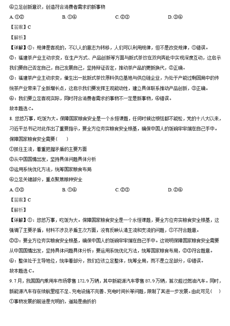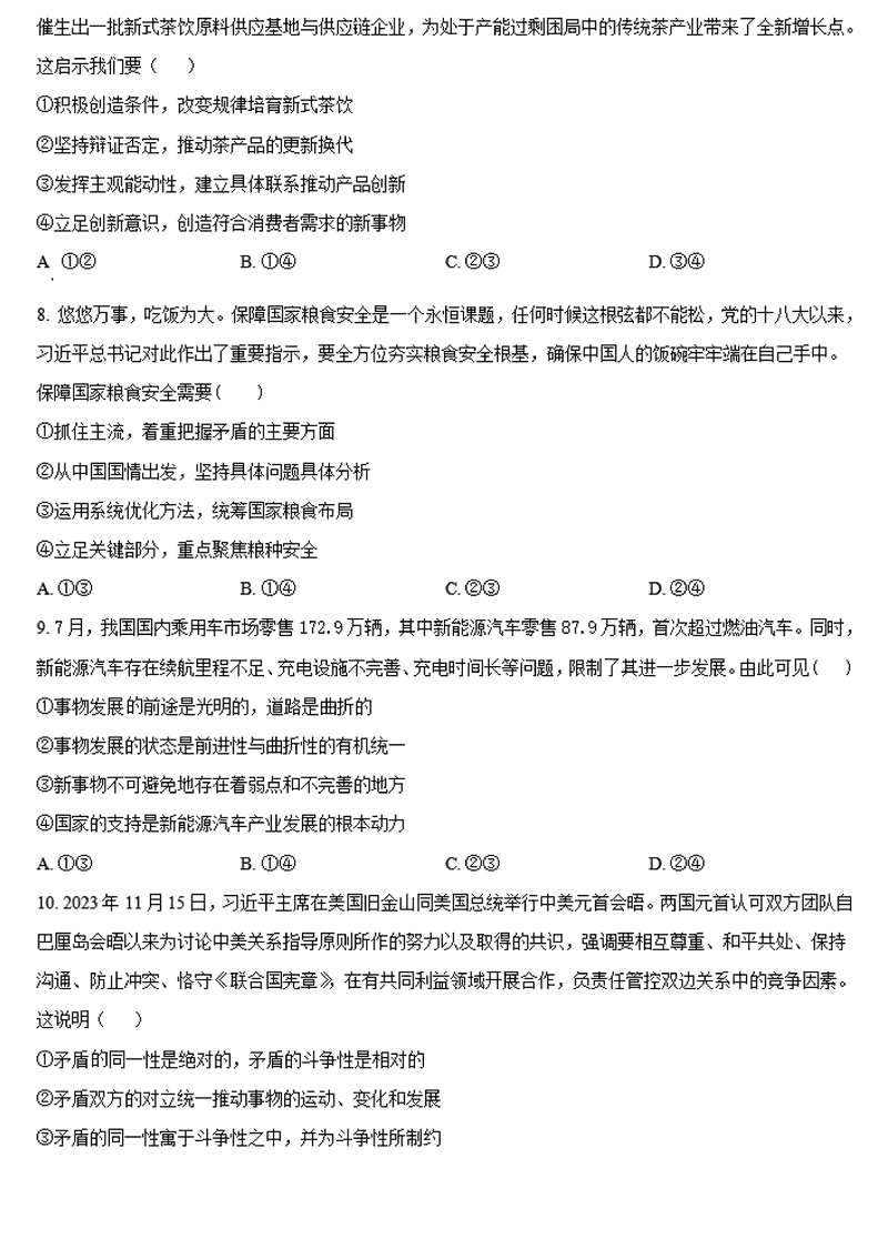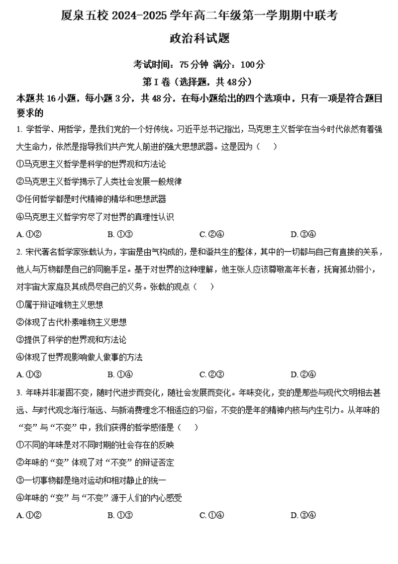 厦泉五校2024年11月高二上学期期中联考政治试题及答案