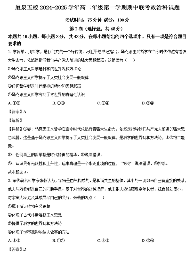 厦门市、泉州市五校2024-2025学年高二上学期11月期中联考政治考试已于近日开考,为方便考生考后及时查看考试情况,查漏补缺、弥补不足,本文整理了试题答案解析相关信息!