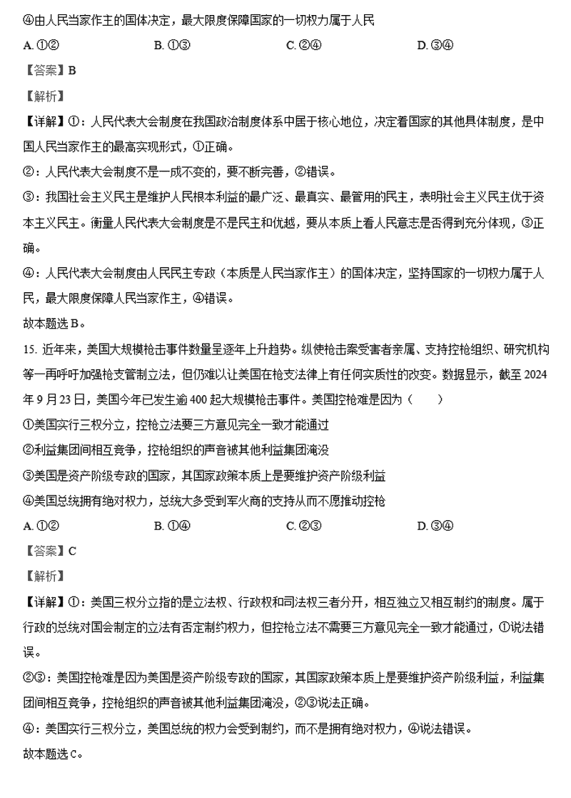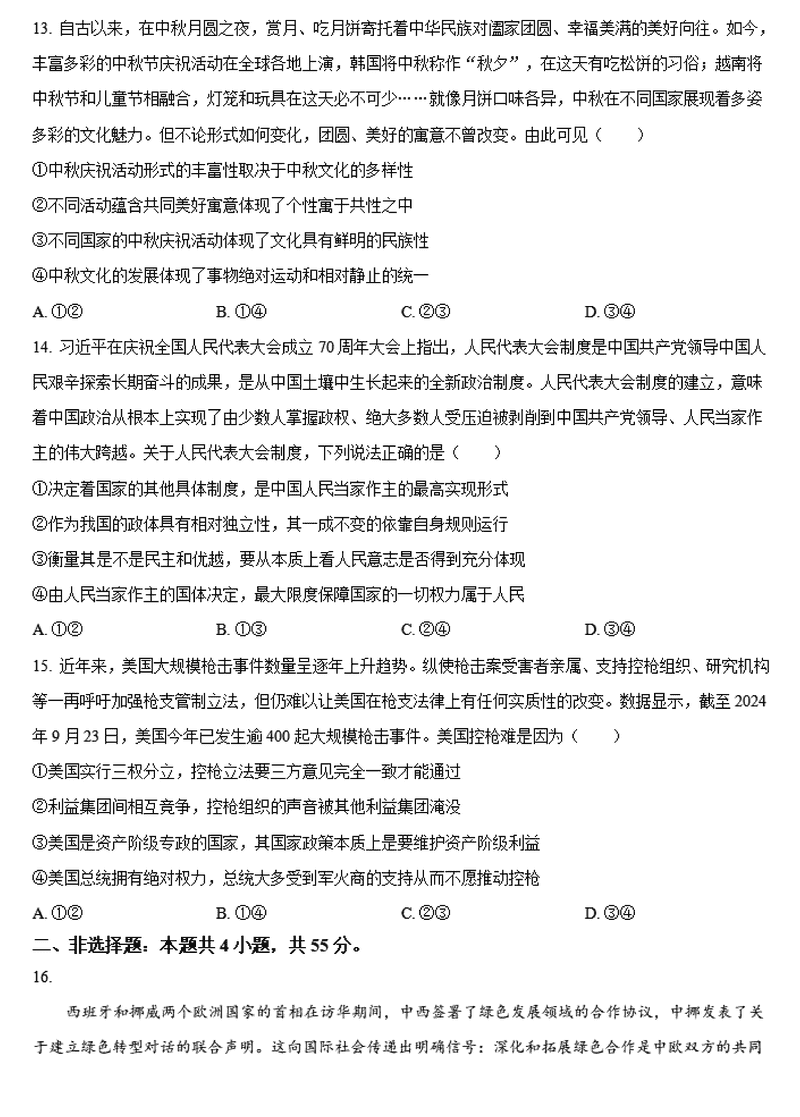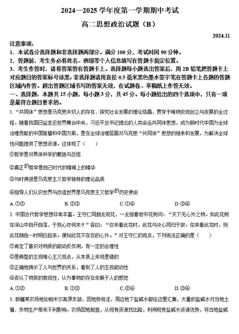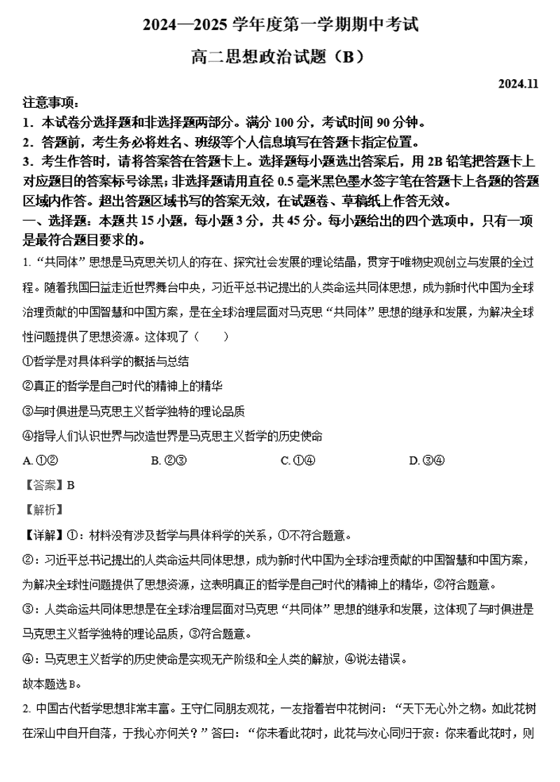 山东菏泽2024-2025学年高二上学期期中政治试题及答案