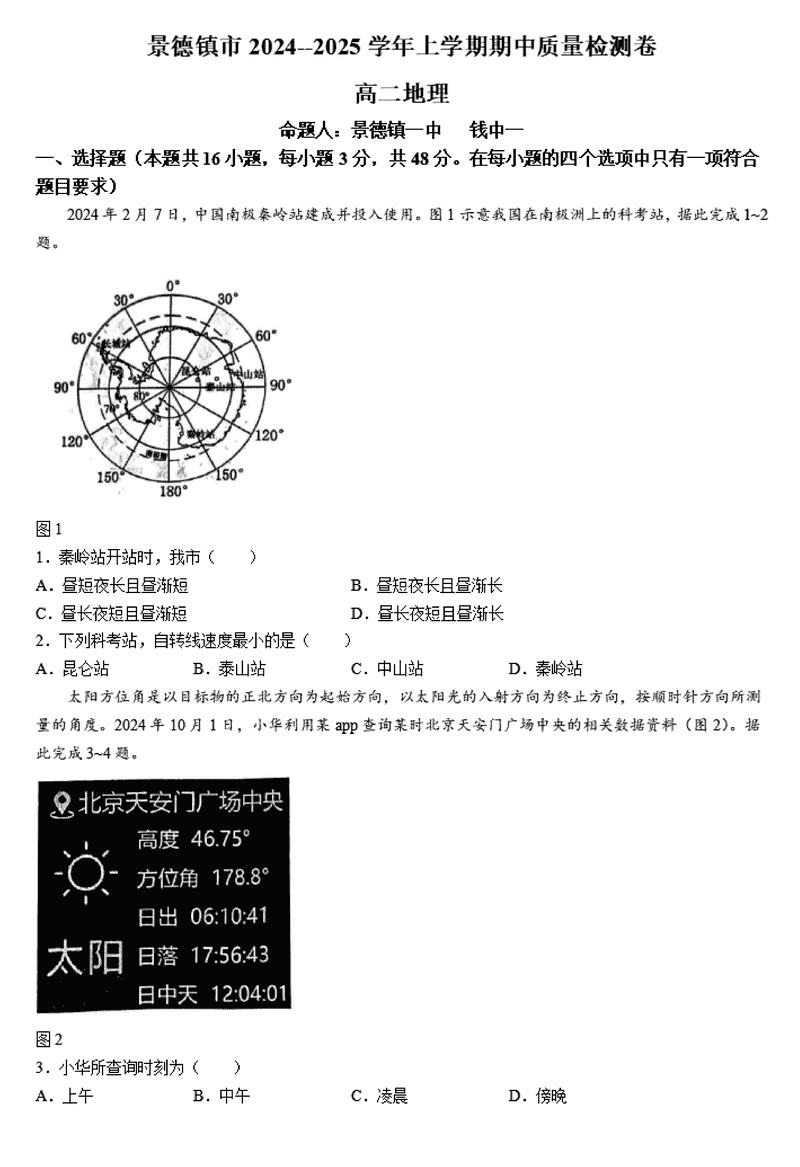景德镇市2024-2025学年高二上学期11月期中地理试题及答案