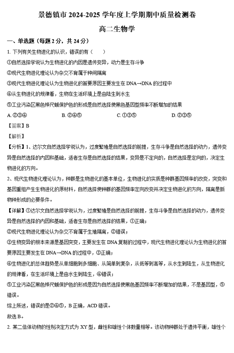 景德镇市2024-2025学年高二上学期11月期中生物试题及答案