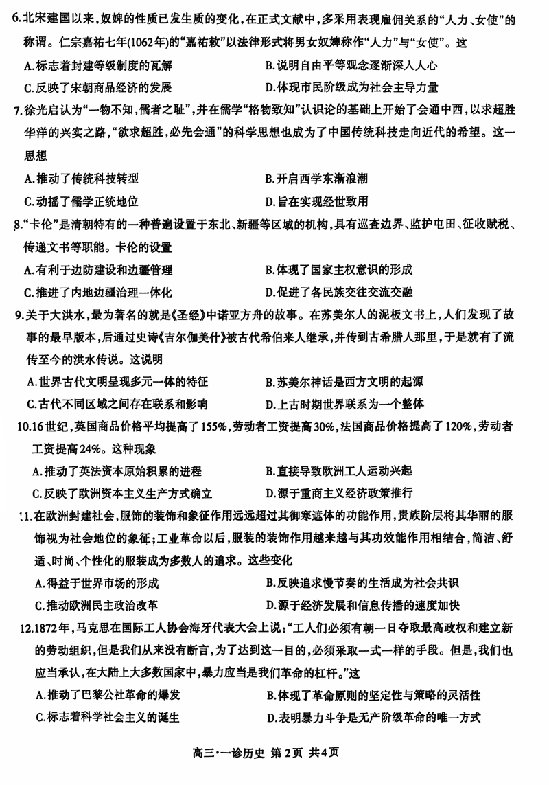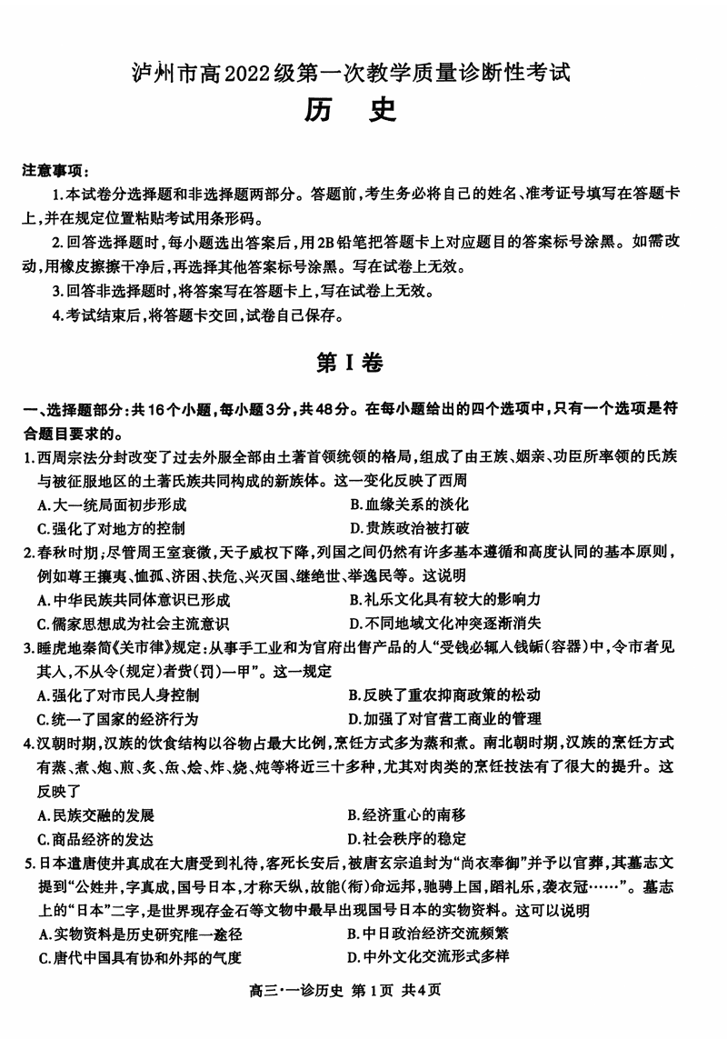 泸州一诊高2025届第一次教学质量诊断历史试题及答案