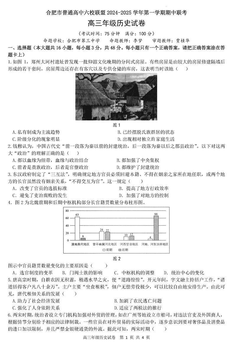 合肥六校联盟2025届高三上学期期中联考历史试题及答案