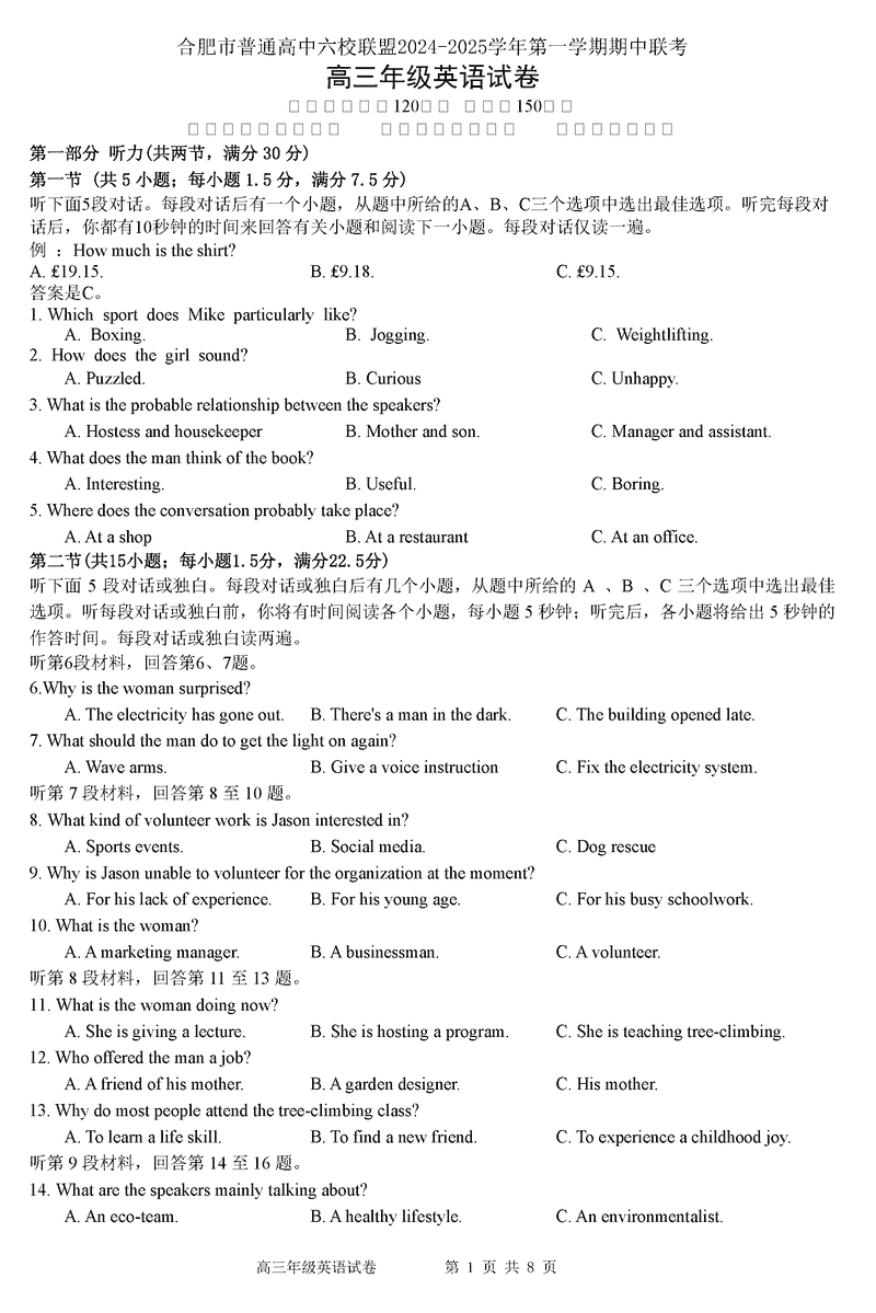 合肥六校联盟2025届高三上学期期中联考英语试题及答案