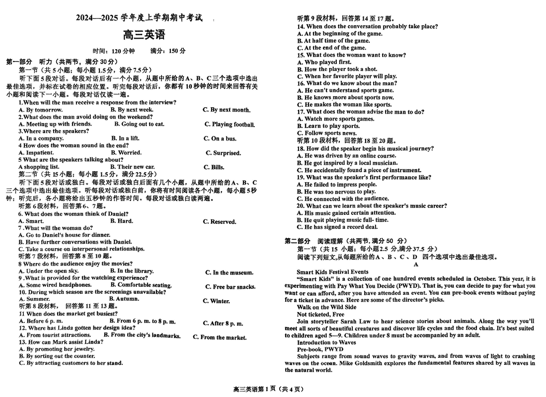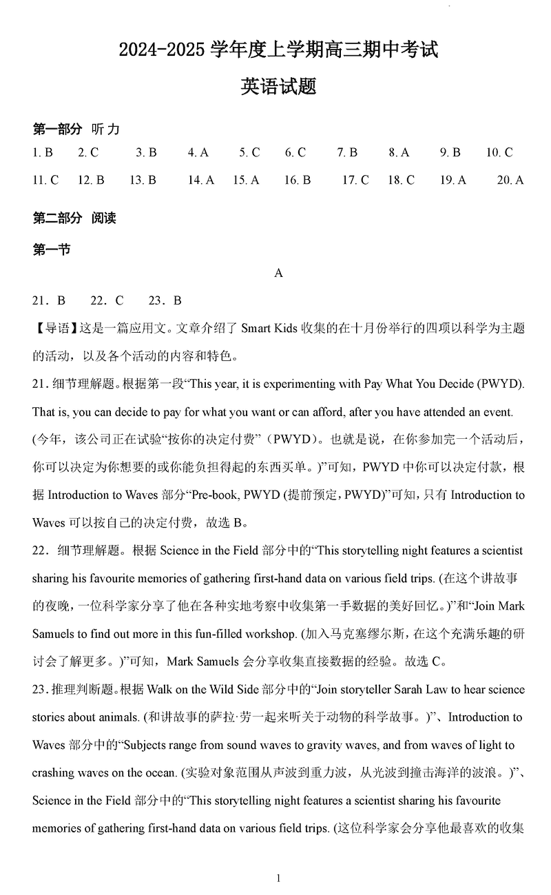 鞍山市重点高中协作校2025届高三上学期期中英语试题及答案