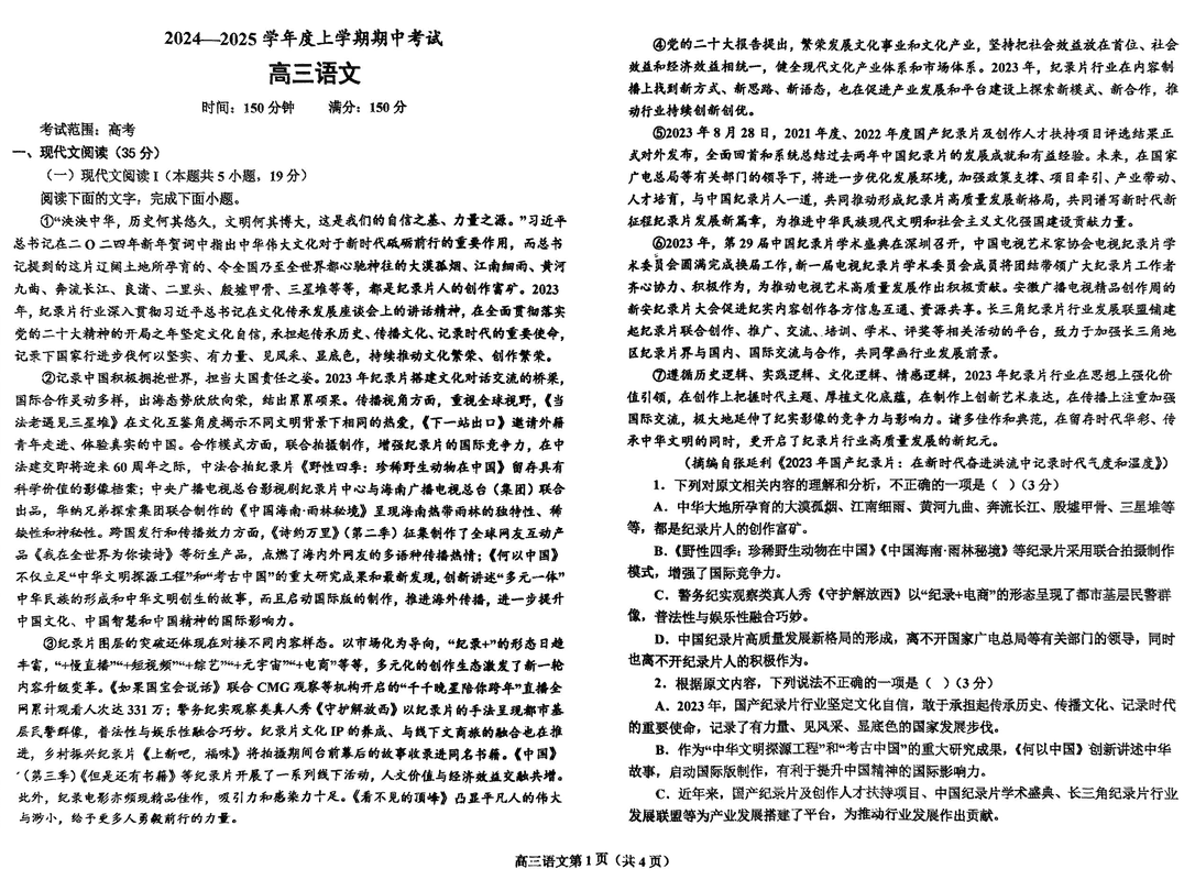 鞍山市重点高中协作校2025届高三上学期期中语文试题及答案