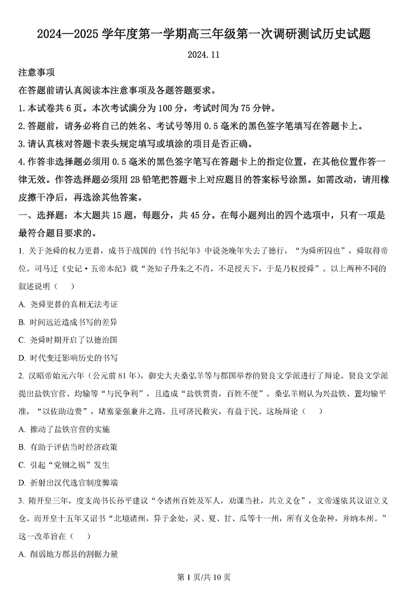 淮安市2025届高三上学期第一次调研测试历史试题及答案