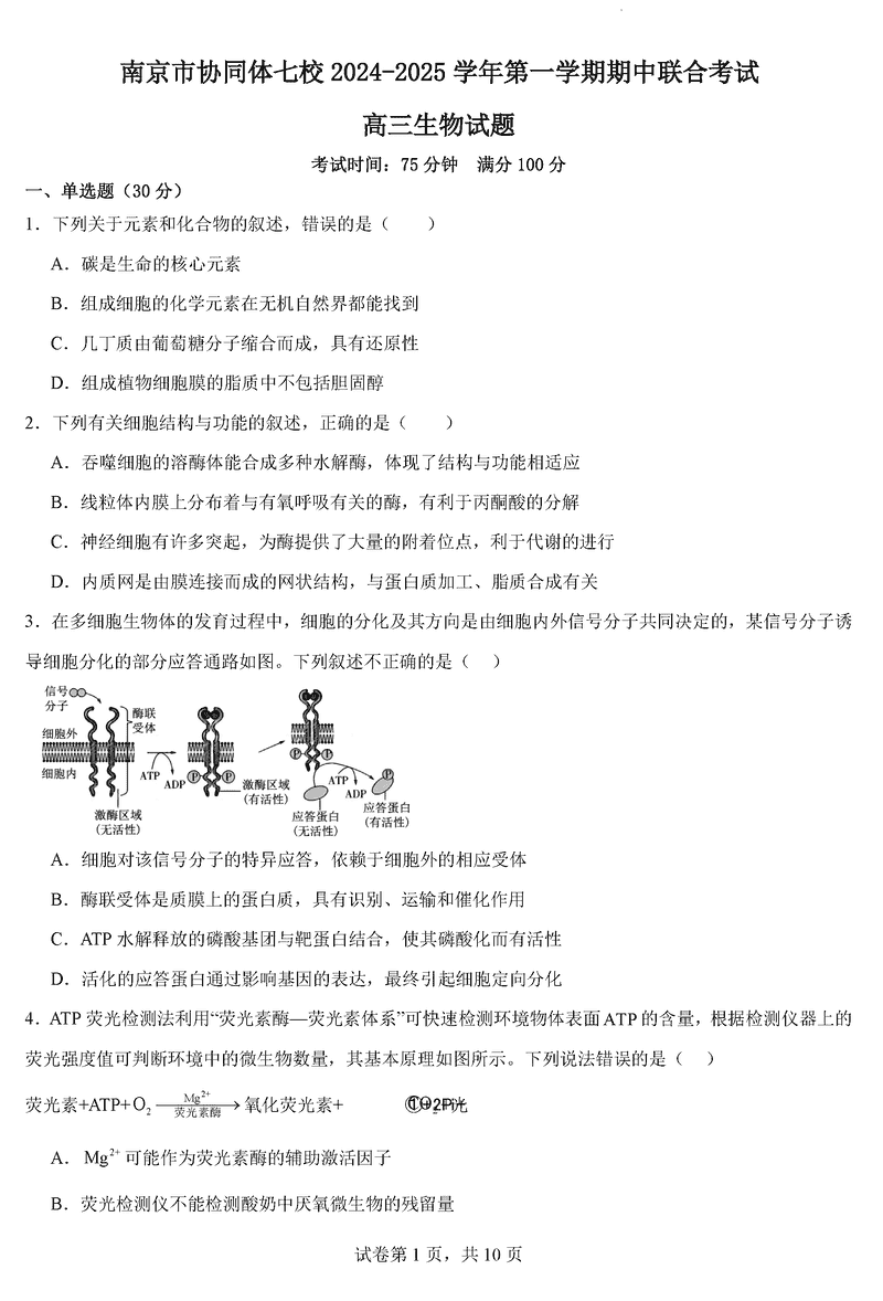 南京协同体七校2025届高三期中联考生物试题及答案 时间:2024-12-02 17:30 江苏 理综试题 南京协同体七校2025届高三期中联考生物考试已于近日开考,为方便考生考后及时查看考试情况,查漏补缺、弥补不足,本文整理了试题答案解析相关信息! 汇总:南京协同体七校2025届高三期中联考试题及答案汇总 生物试题及答案解析