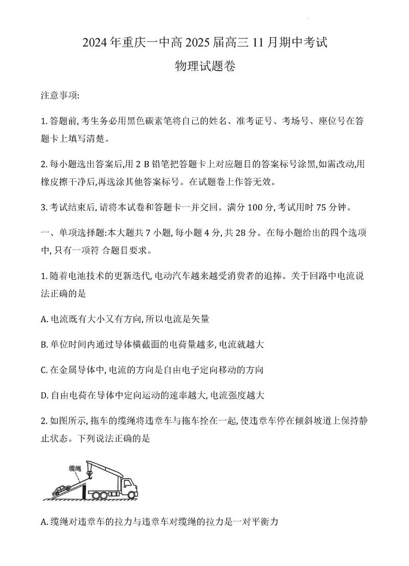 重庆一中2025届高三上学期11月期中物理试题及答案