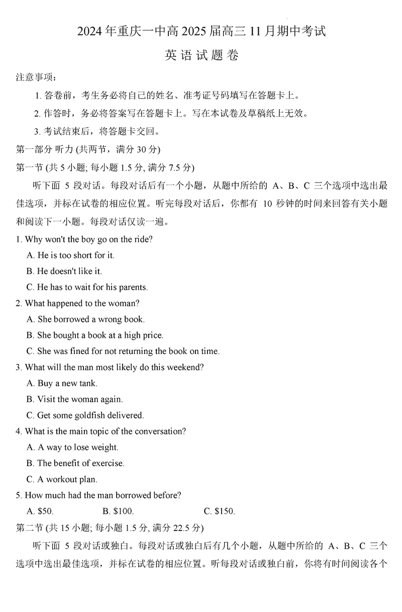 重庆一中2025届高三上学期11月期中英语试题及答案