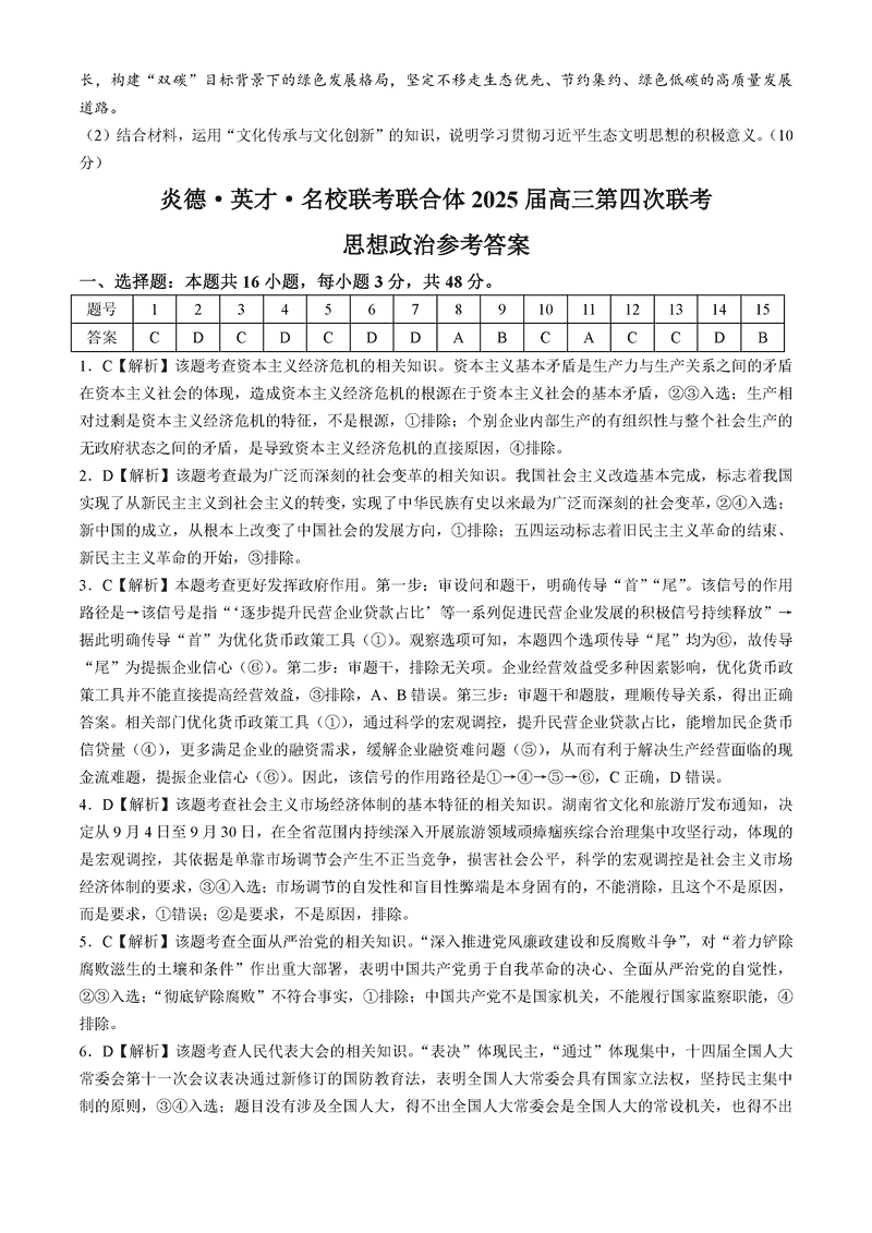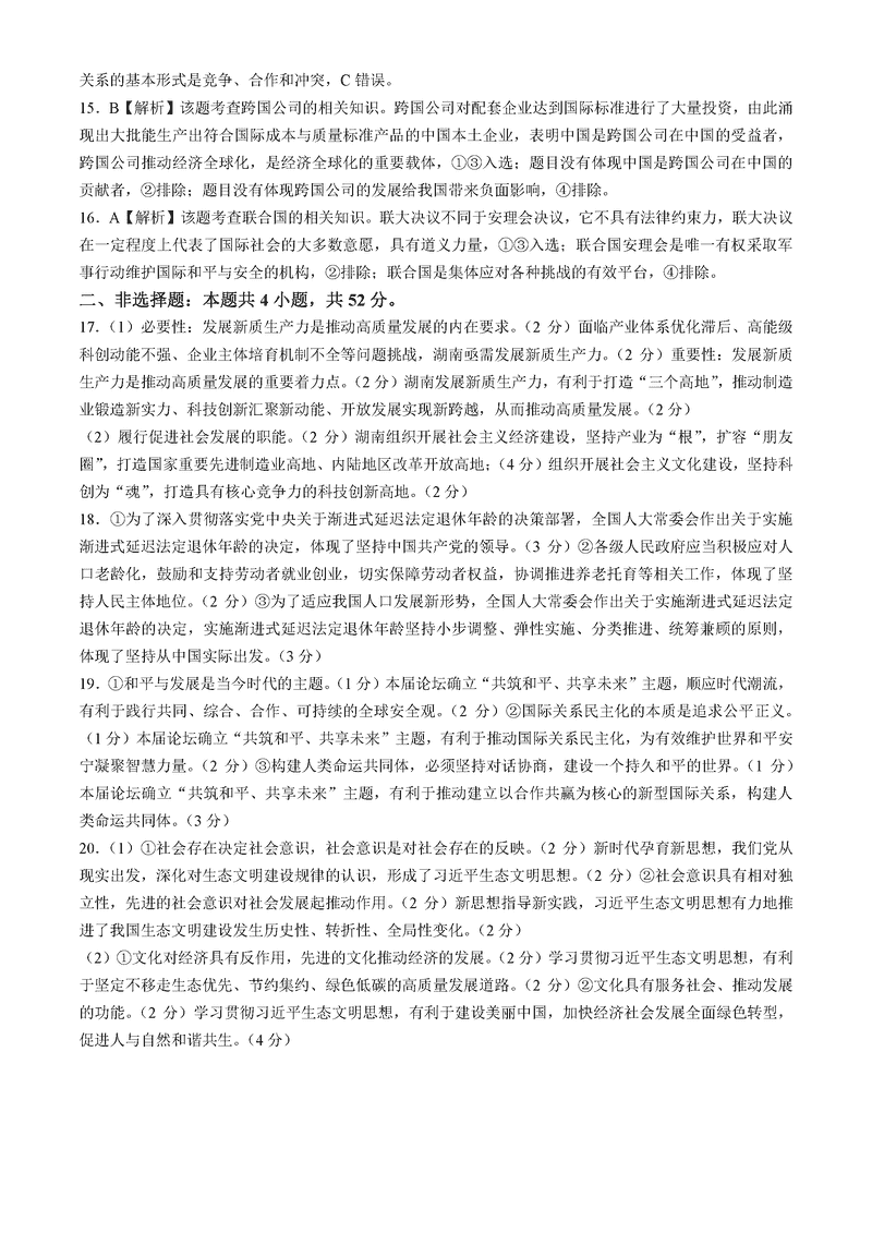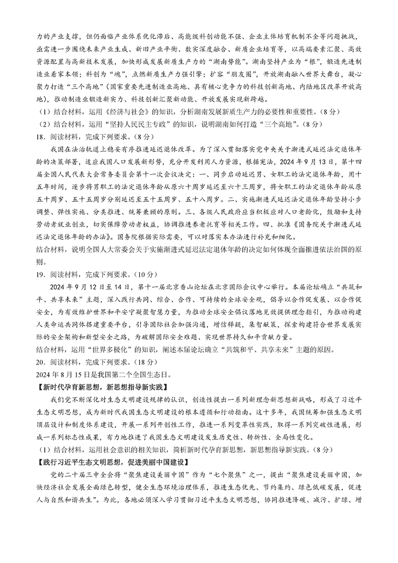 湖南名校联考联合体2025届高三第四次联考政治试题及答案
