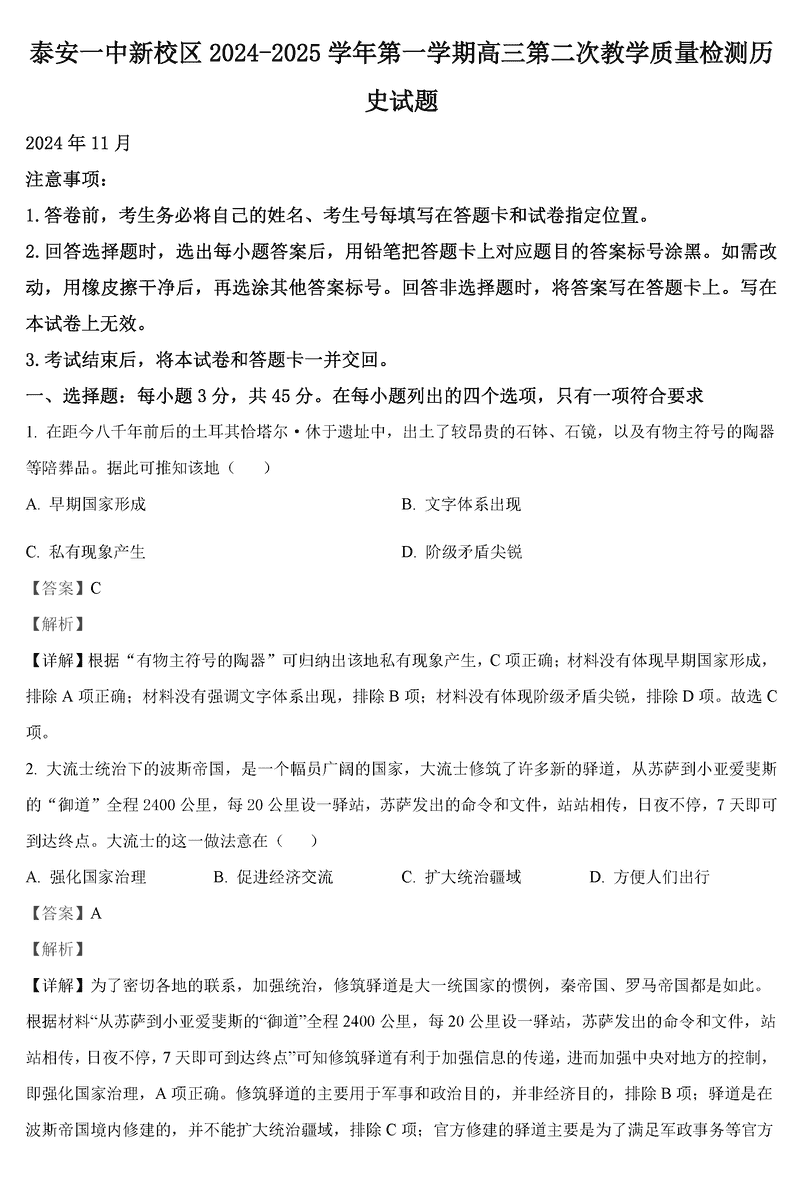 山东泰安一中2025届高三上学期11月月考历史考试已于近日开考,为方便考生考后及时查看考试情况,查漏补缺、弥补不足,本文整理了试题答案解析相关信息!