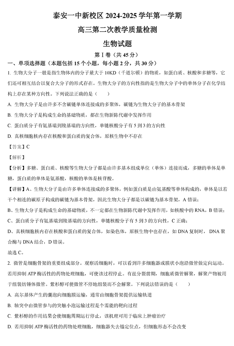 山东泰安一中2025届高三上第二次质检生物试题及答案