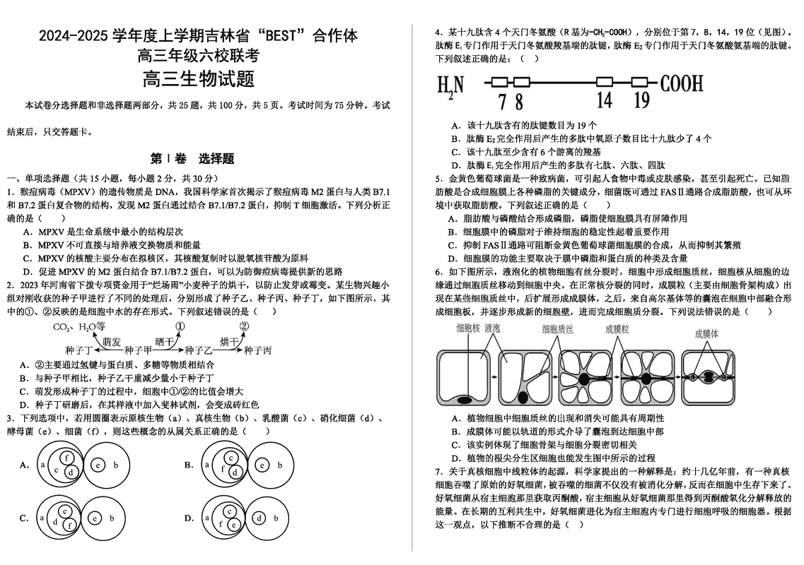 吉林BEST合作体六校2025届高三上学期第三次联考生物试题及答案