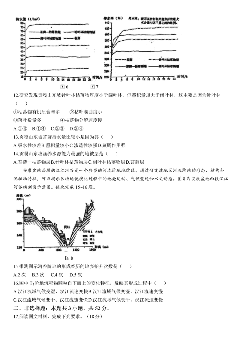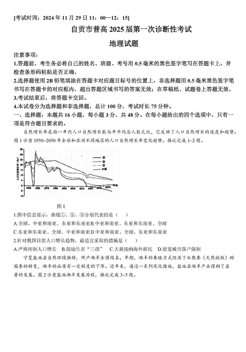 四川自贡普高2025届高三第一次诊断性考地理试题及答案