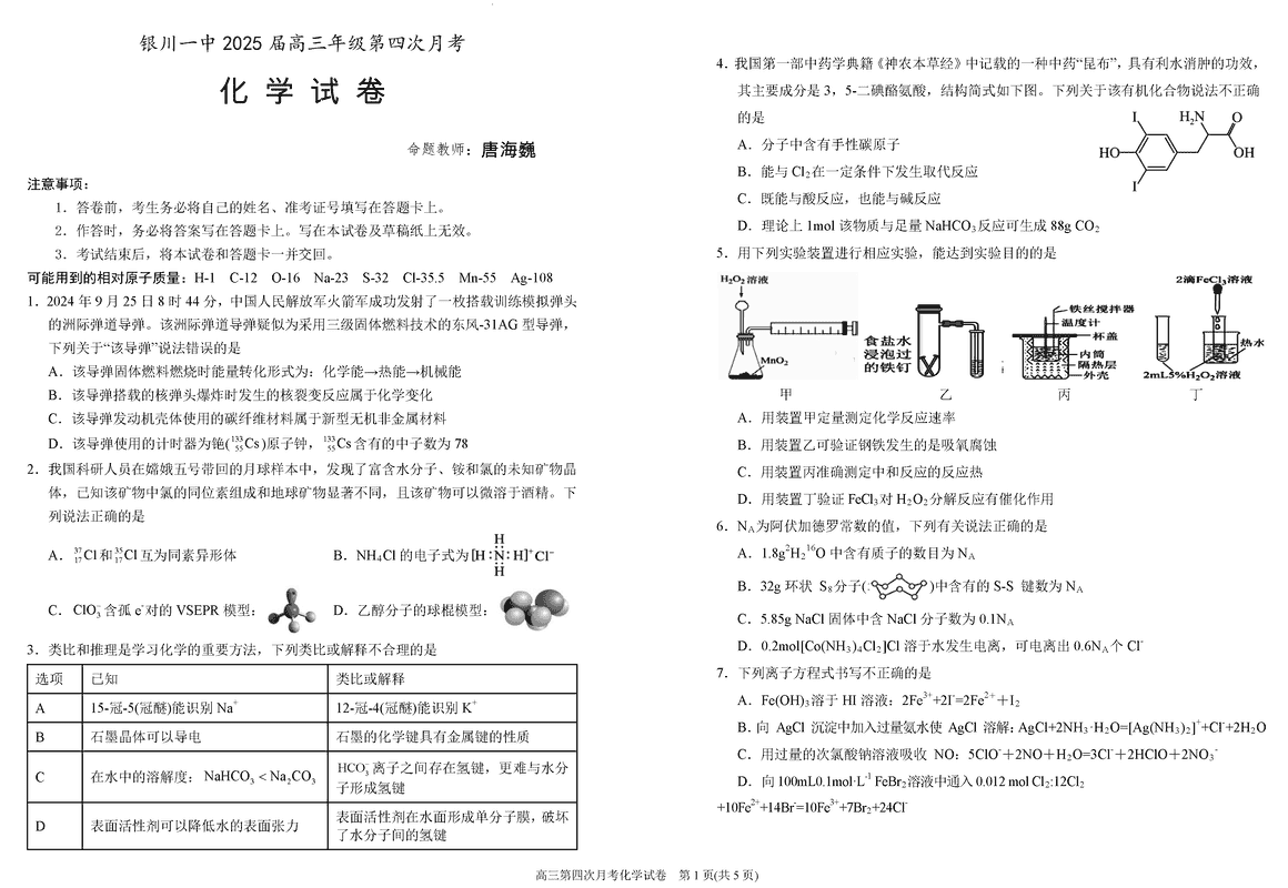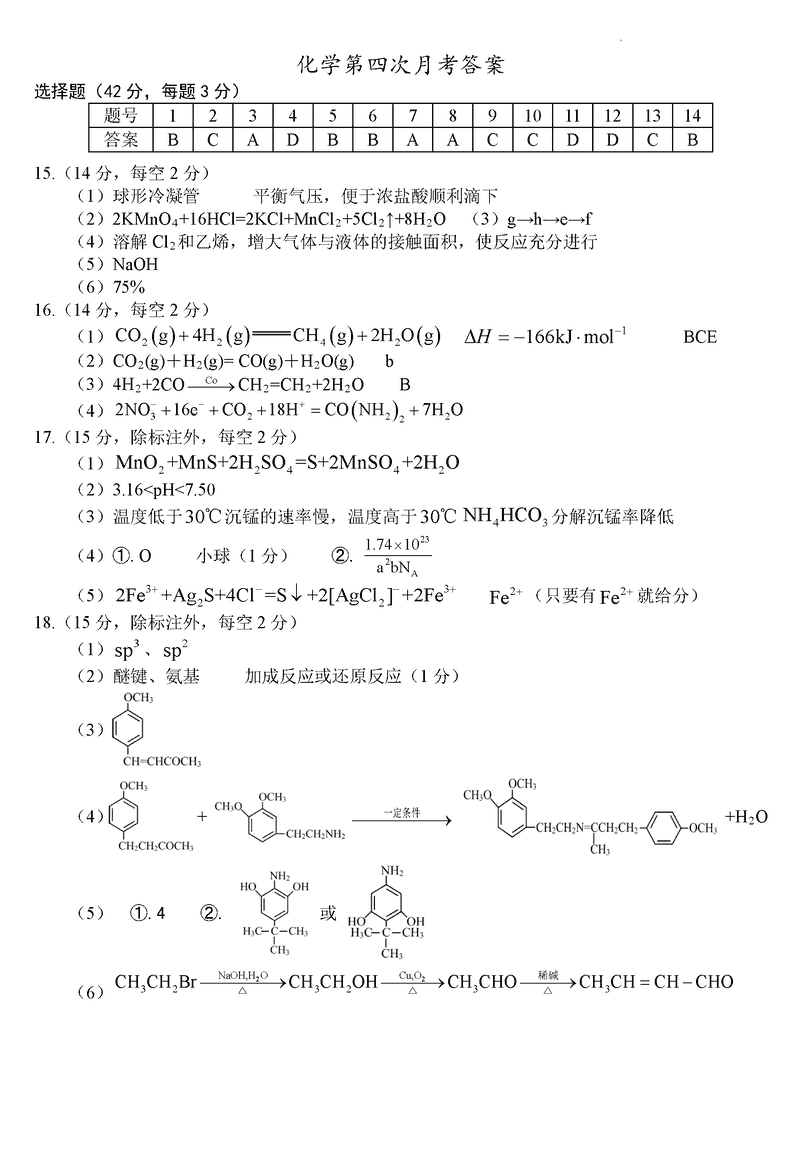 银川一中2025届高三上学期第四次月考化学试题及答案 时间:2024-12-05 17:39 宁夏 理综试题 银川一中2025届高三上学期第四次月考化学考试已于近日开考,为方便考生考后及时查看考试情况,查漏补缺、弥补不足,本文整理了试题答案解析相关信息! 汇总:银川一中2025届高三上学期第四次月考试题及答案汇总 化学试题及答案解析