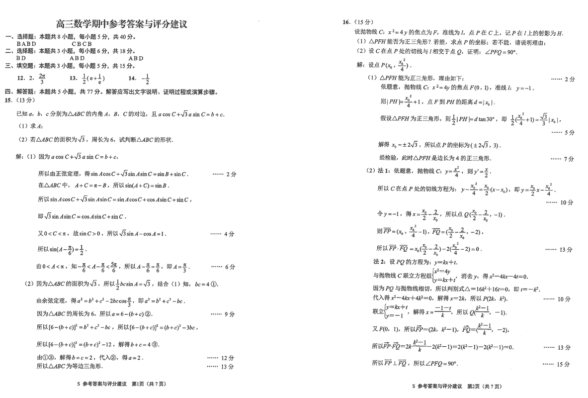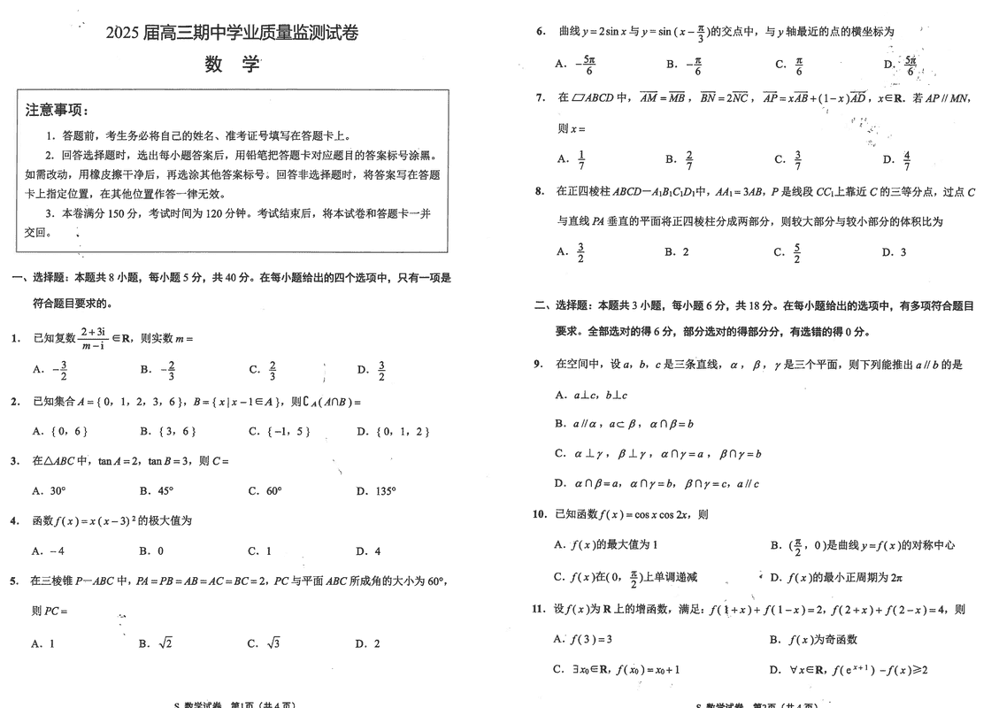 海安高级中学2025届高三上学期期中数学试题及答案