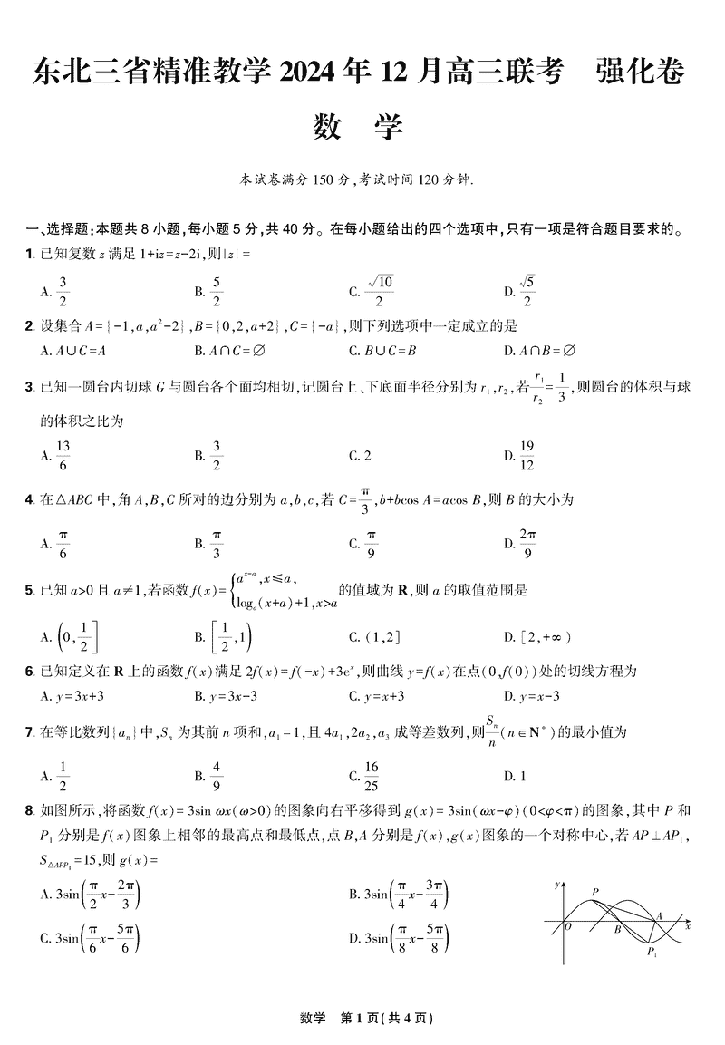 东北三省精准教学2025届高三上学期12月联考数学试题及答案