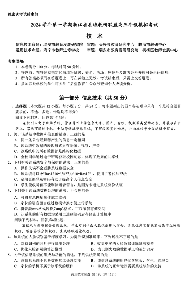 浙江县域教研联盟2025届高三上学期摸底考技术考试已于近日开考,为方便考生考后及时查看考试情况,查漏补缺、弥补不足,本文整理了试题答案解析相关信息!