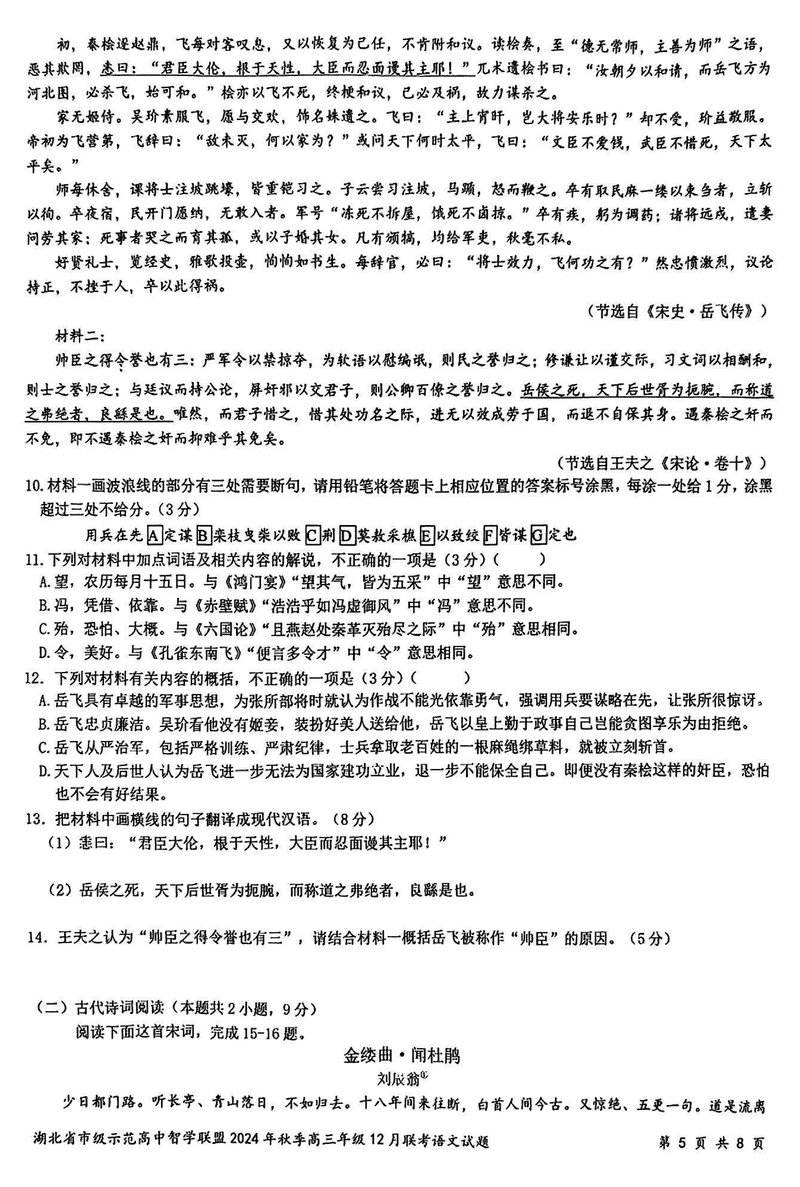 湖北智学联盟2024年秋季高三12月联考语文试题及答案